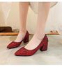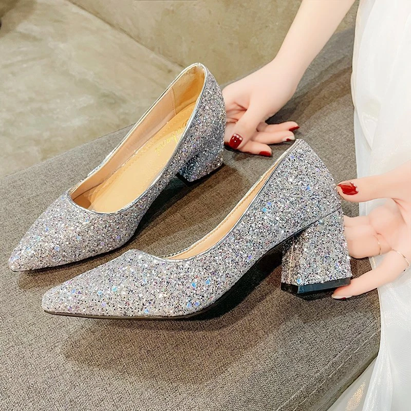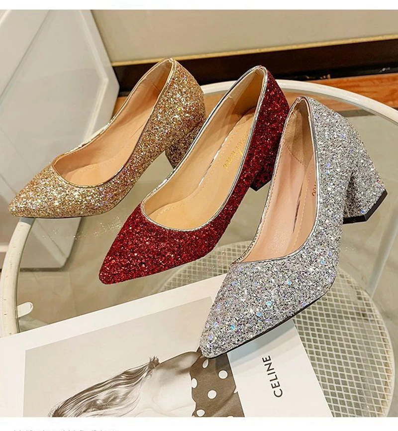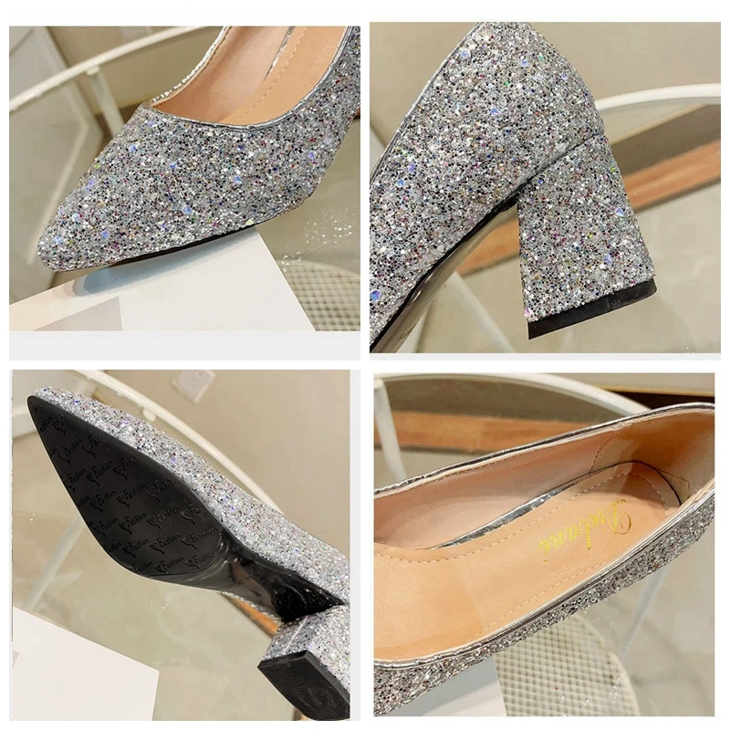New 2022 Summer Pointed High-heeled Shoes Sequin Women's Single Thick Heel Party Wedding Evening Dress Large Size 42