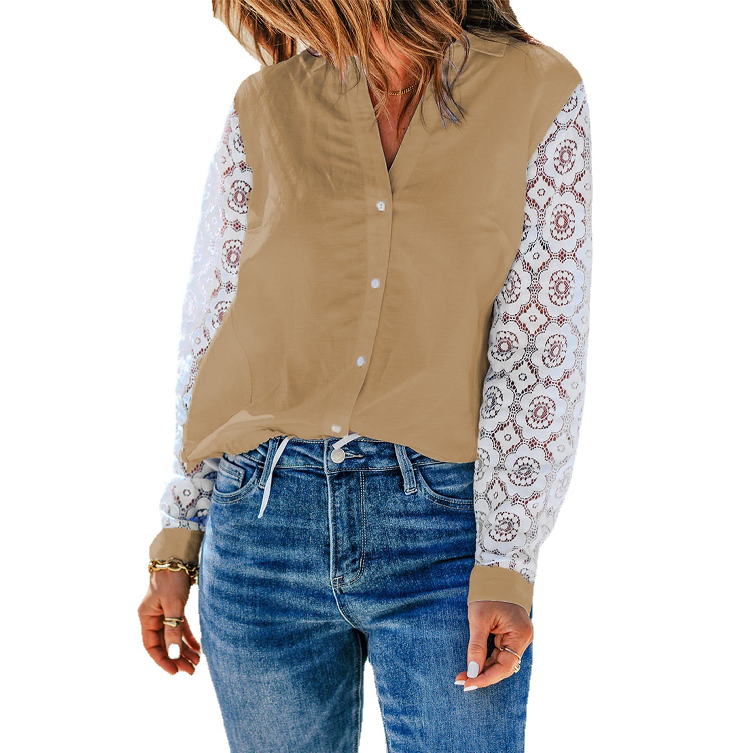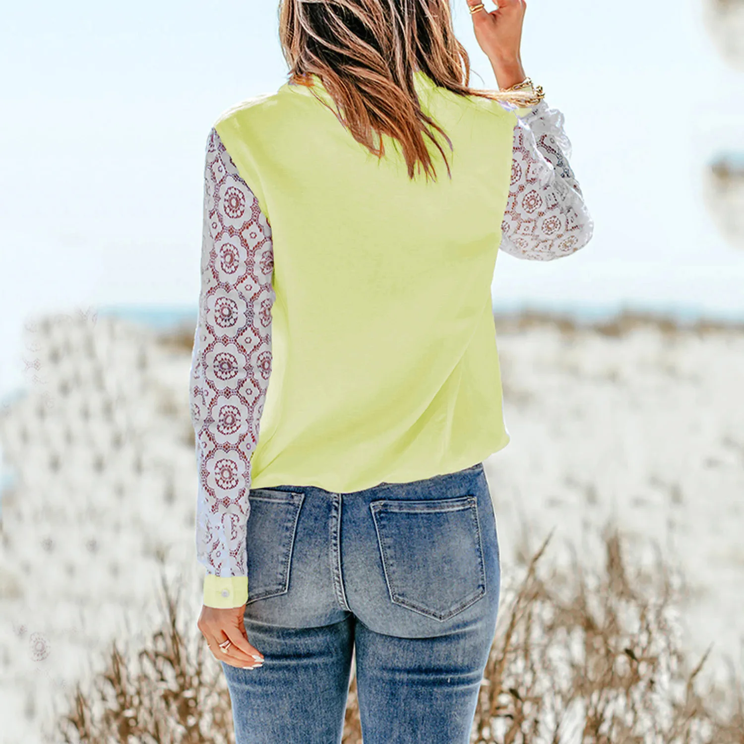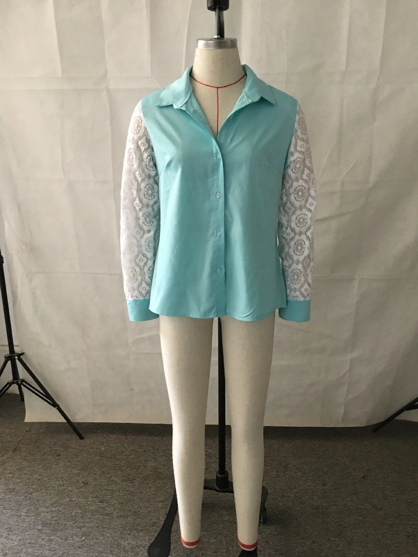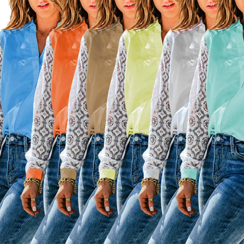 New Arrival Cardigan Women's Solid Color Button Lace Splicing Lone-sleeved Blouse Ladies Casual Turn Down Collar Shirts Tops