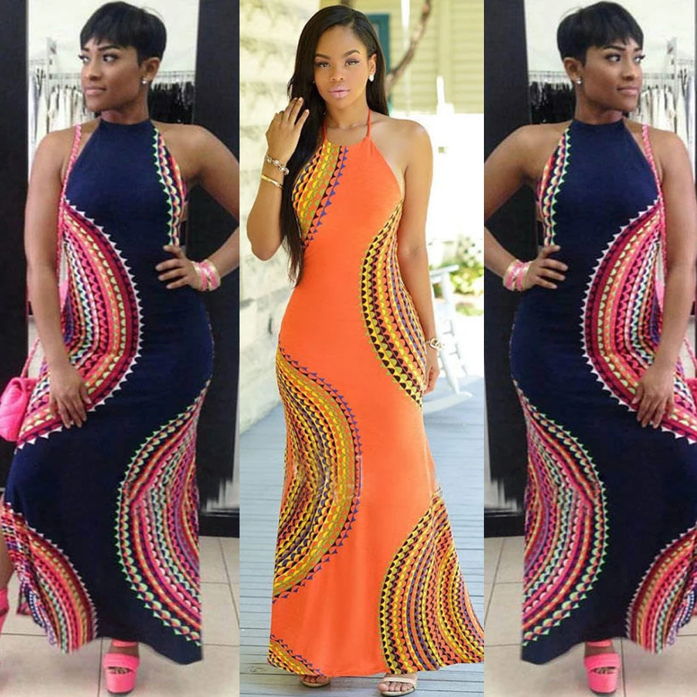 New Fashion Women Halter Dress Sleeveless Female Party Dress Ladies Printing Boho Maxi Long Dress Evening Party Dress