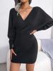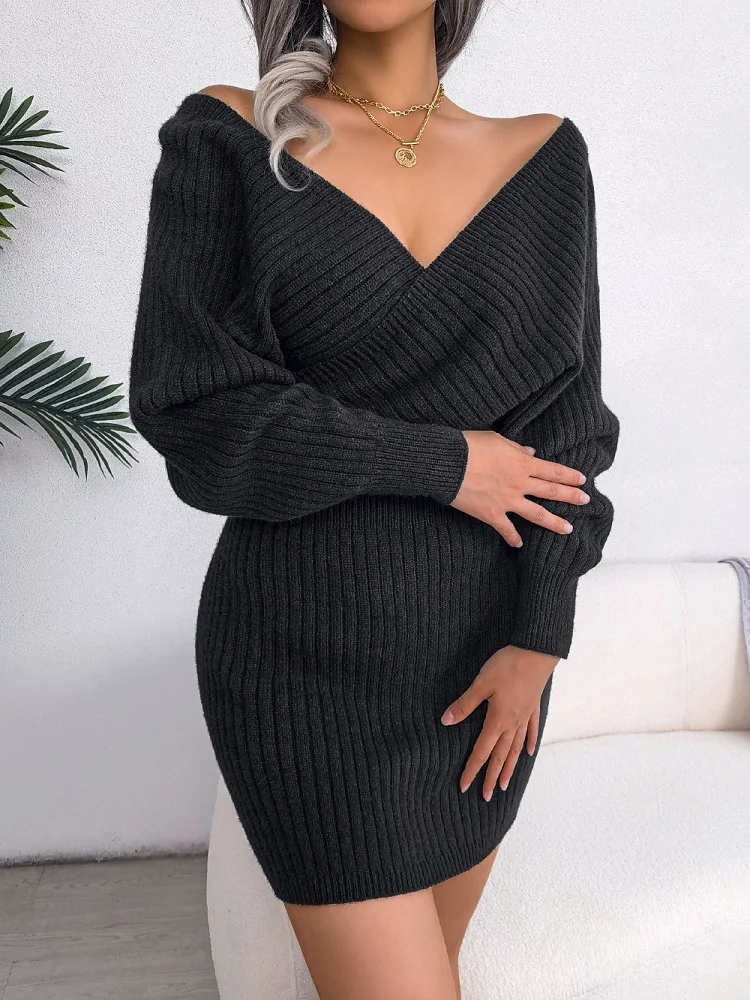 New Women Autumn Winter Solid V-Neck Backless Long Batwing Sleeve Sweater Sexy Elegant Hip Wrap Warm Waist Knitted Dress Clothe