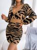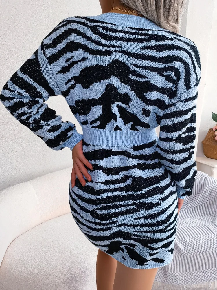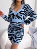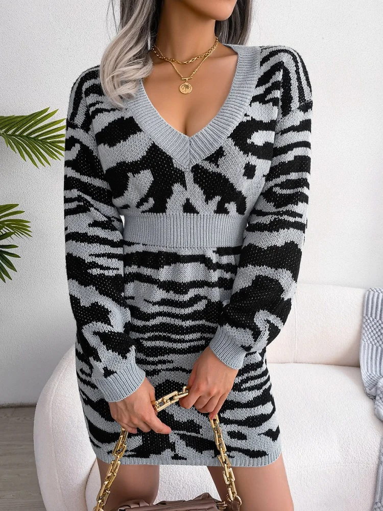 New Women Spring Autumn Fashion V-Neck Tiger Pattern Elastic Waist Knit Long Sleeved Elegant Wweater Dress Ladies Skirt Female
