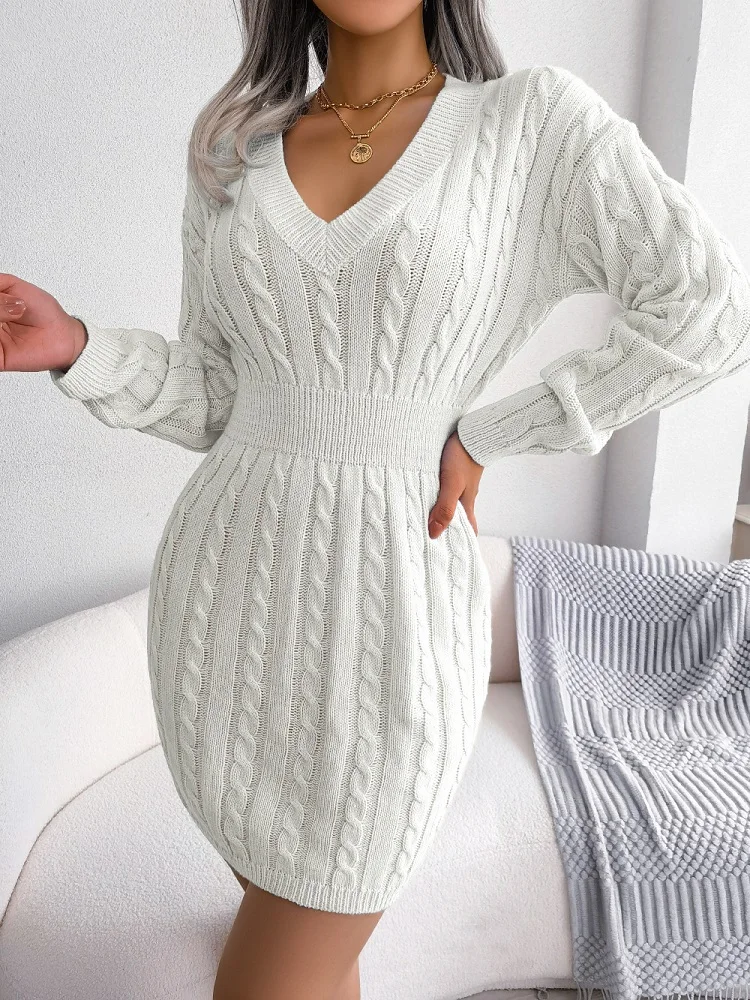 New Women Spring Autumn V-Neck Solid Color Knitting Long Sleeves Closing Waist Pullover Mini Sweater Lady Dress High Quality Sof