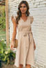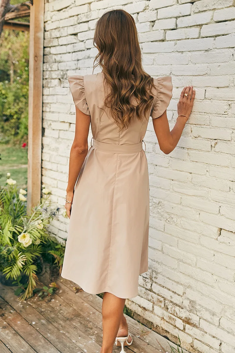 New Women Summer Good Quality Solid A-line Lace Up Woven Elegant Commuter V-Neck Ruffle Sleeve Mid Length Dresses Female Clothin