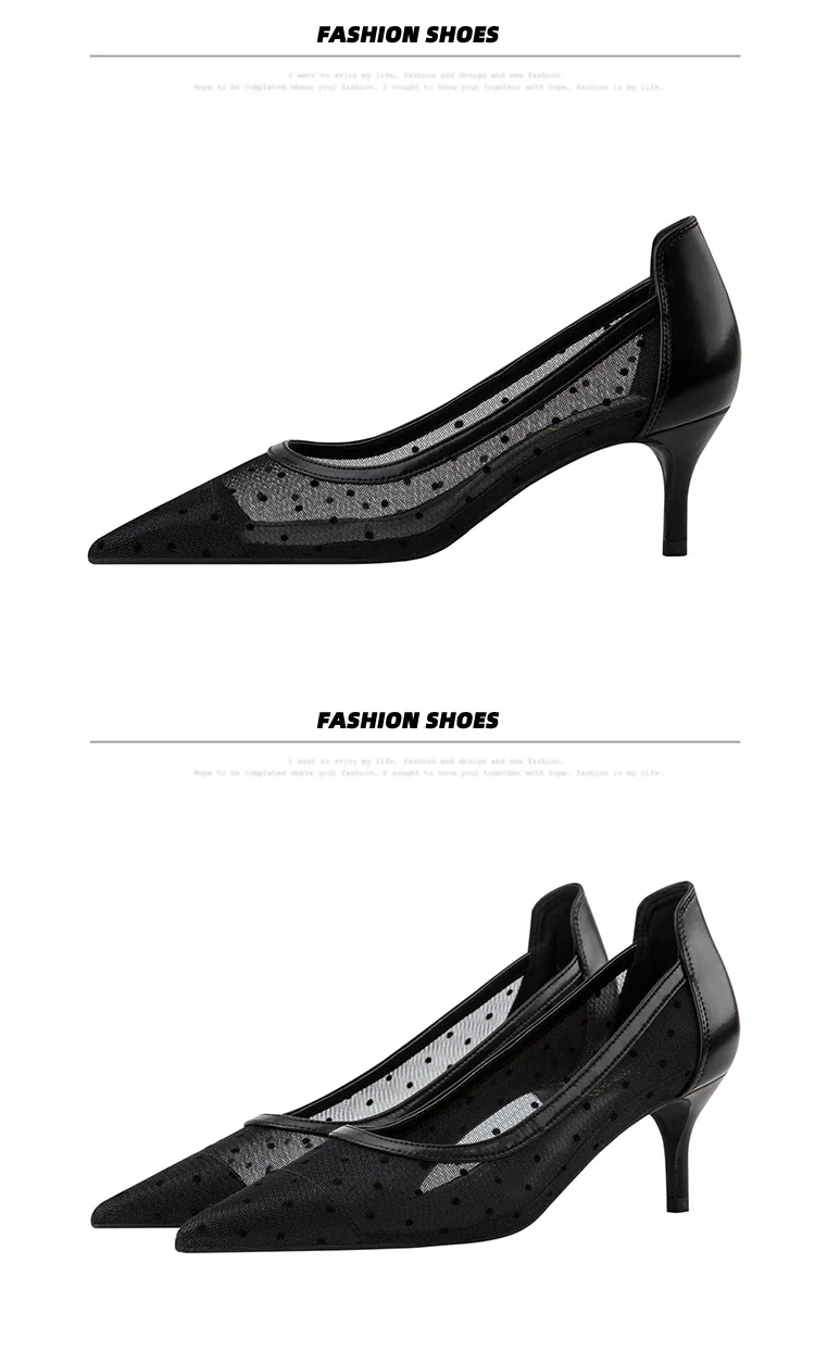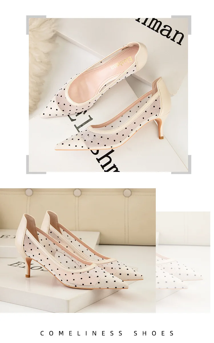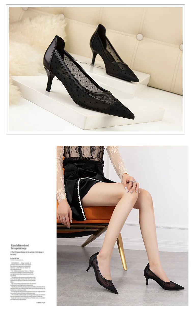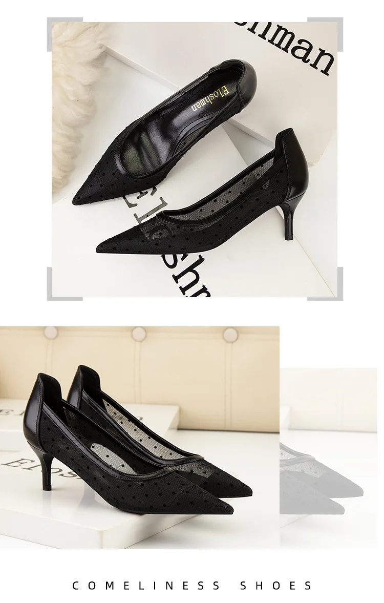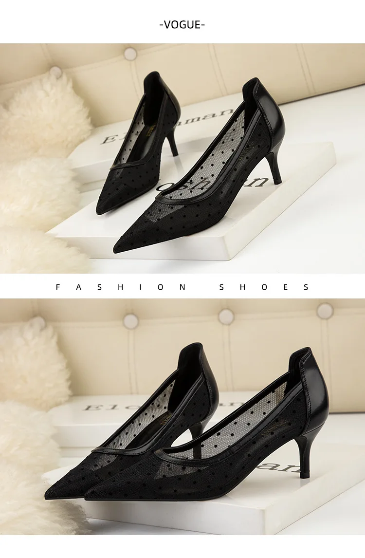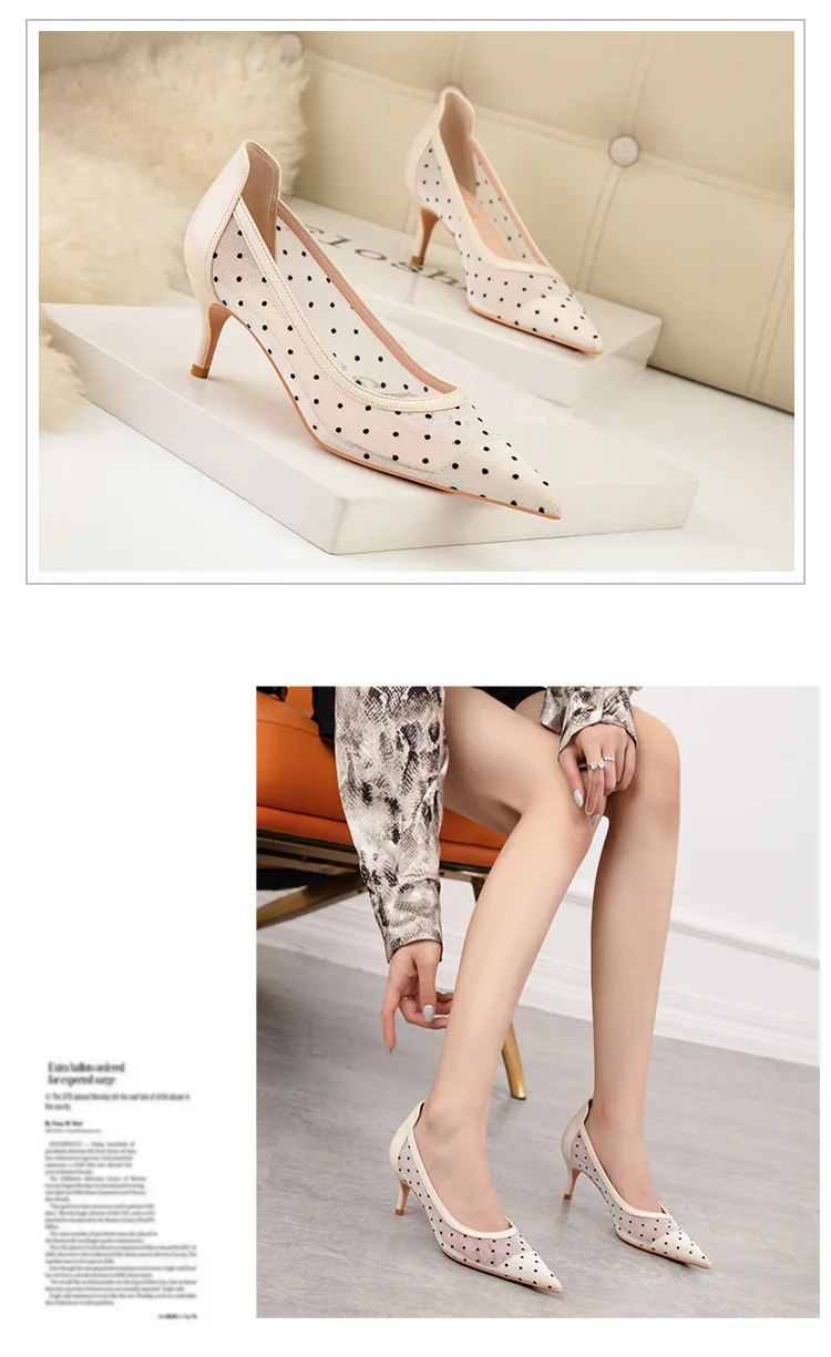 New Women's Fashion Personality Thin High Heels Stiletto High Heels Shallow Mouth Pointed Mesh Hollow Polka Dot Single Shoes