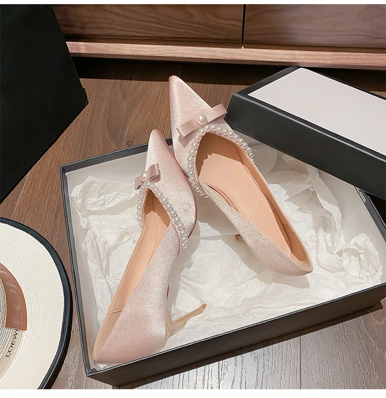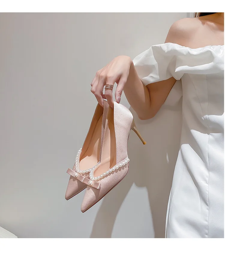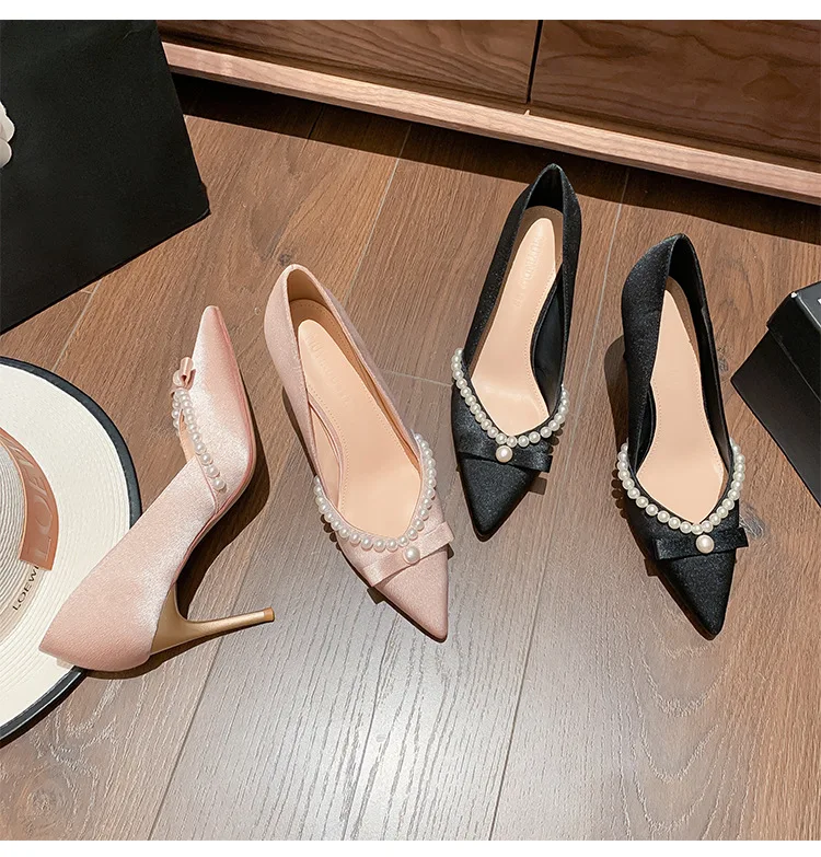 New Women's Summer High Heels Beaded Shallow Solid Pointed Toe Satin Women's Exquisite High Quality Banquet All-match High Heels
