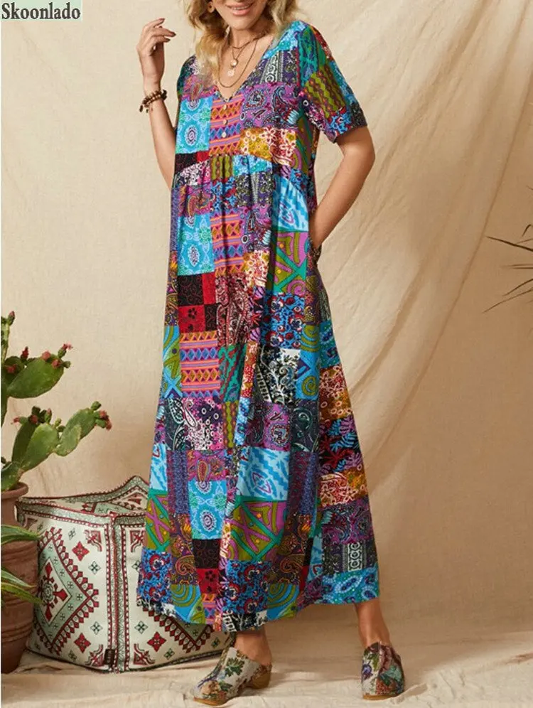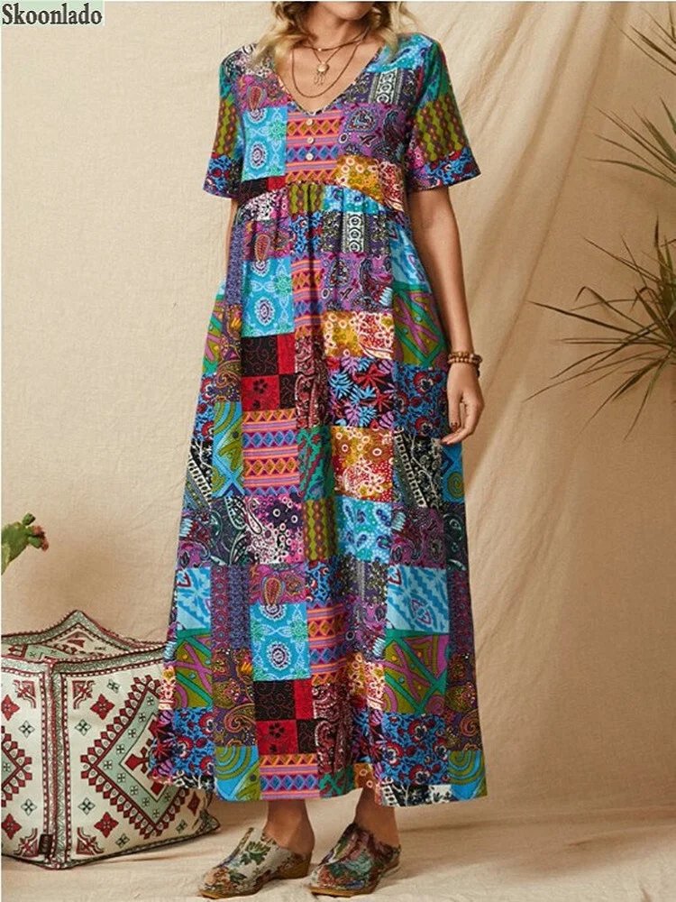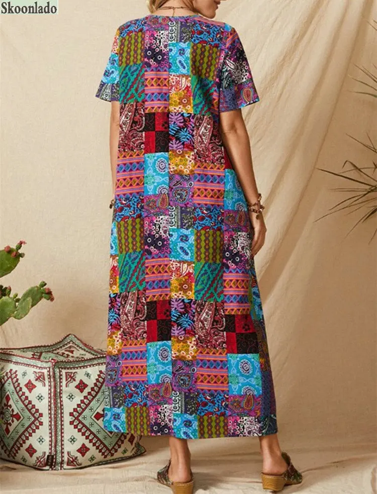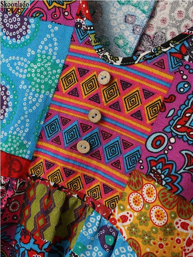 Plus size women V-neck long-sleeved women cotton linen dresses color stitching casual long skirt character printing healthy material