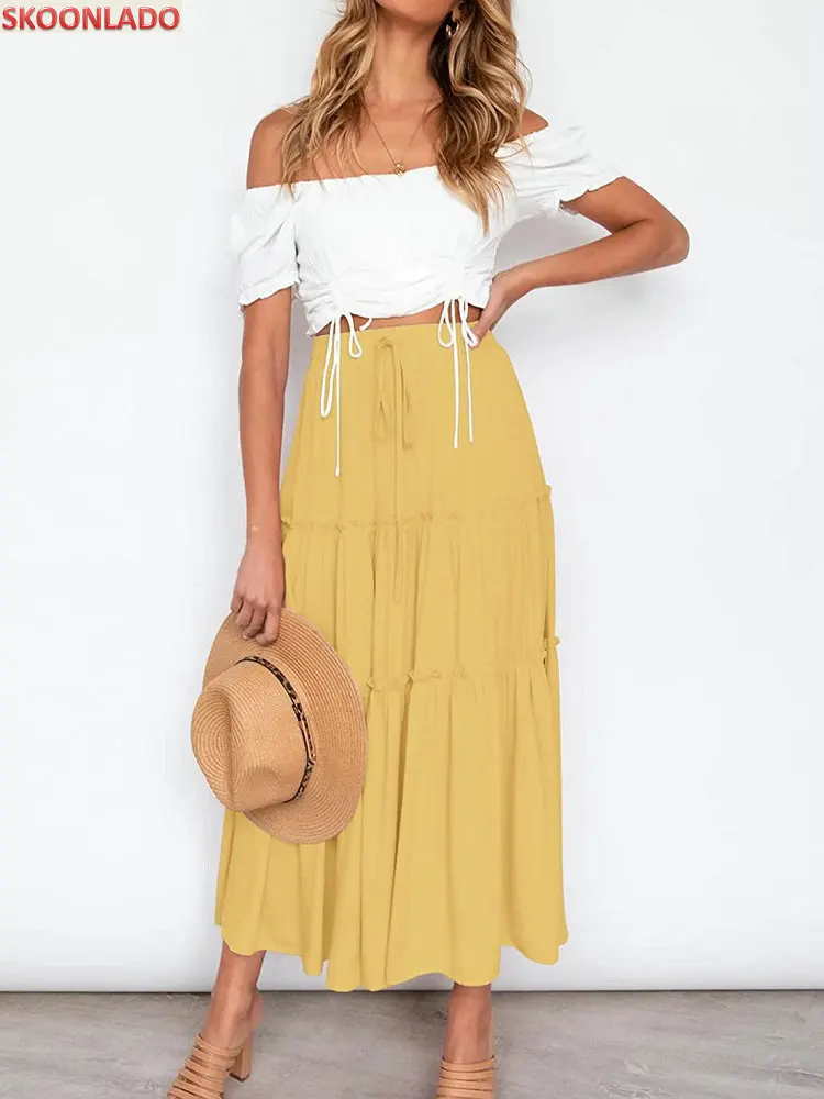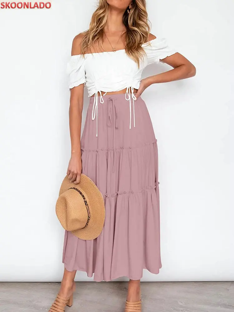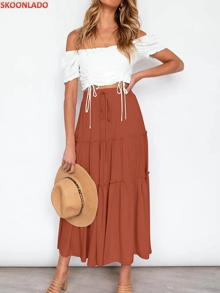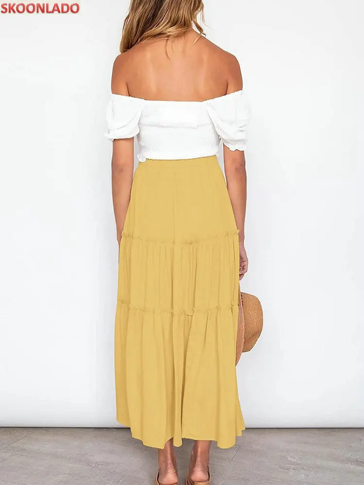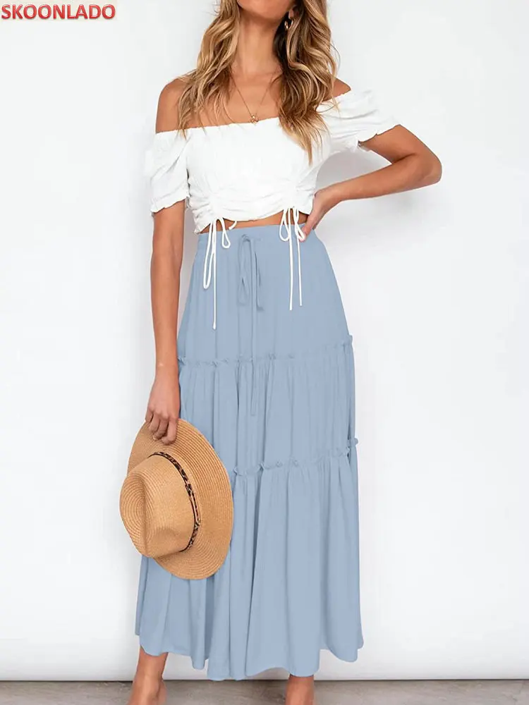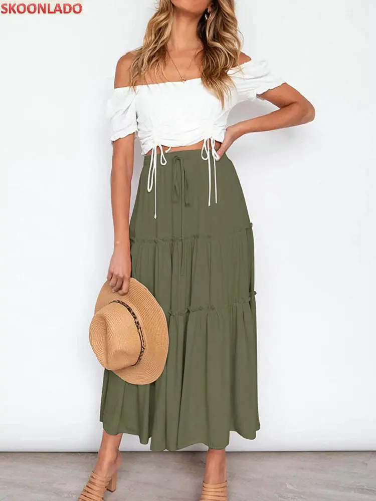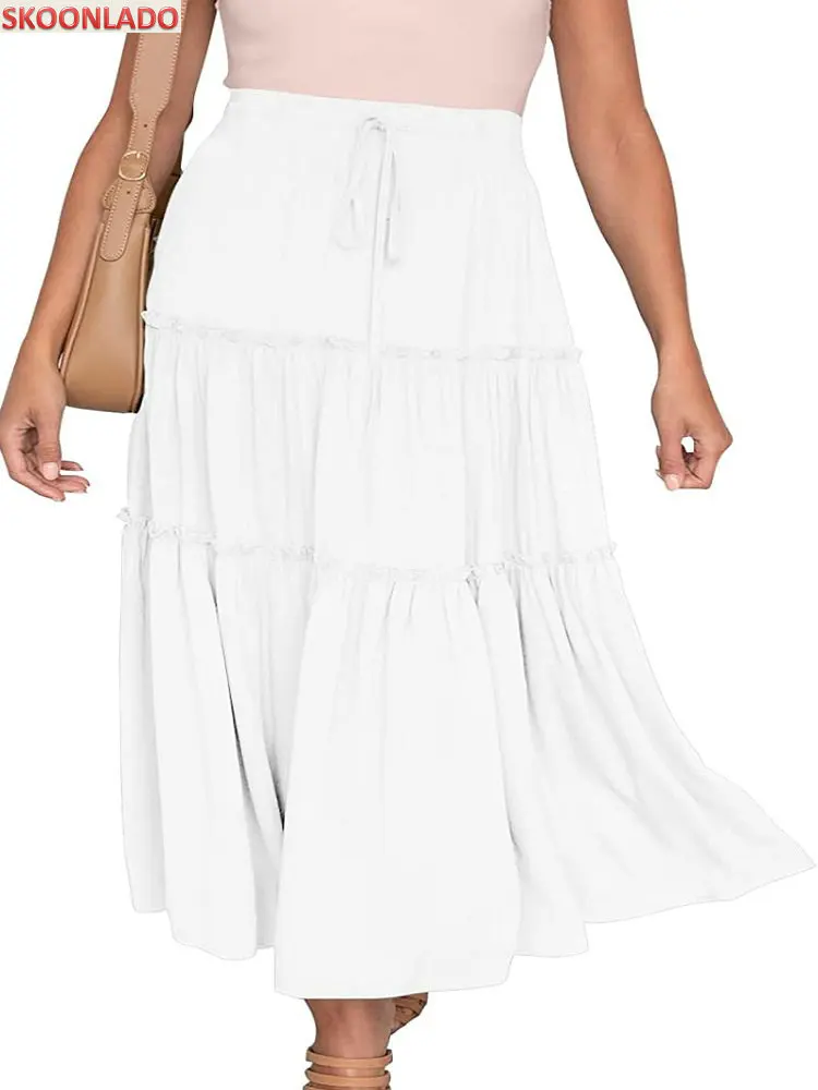 Newest Women High Waist Midi Skirt Boho A-Line Pleated Flowy Summer Skirts