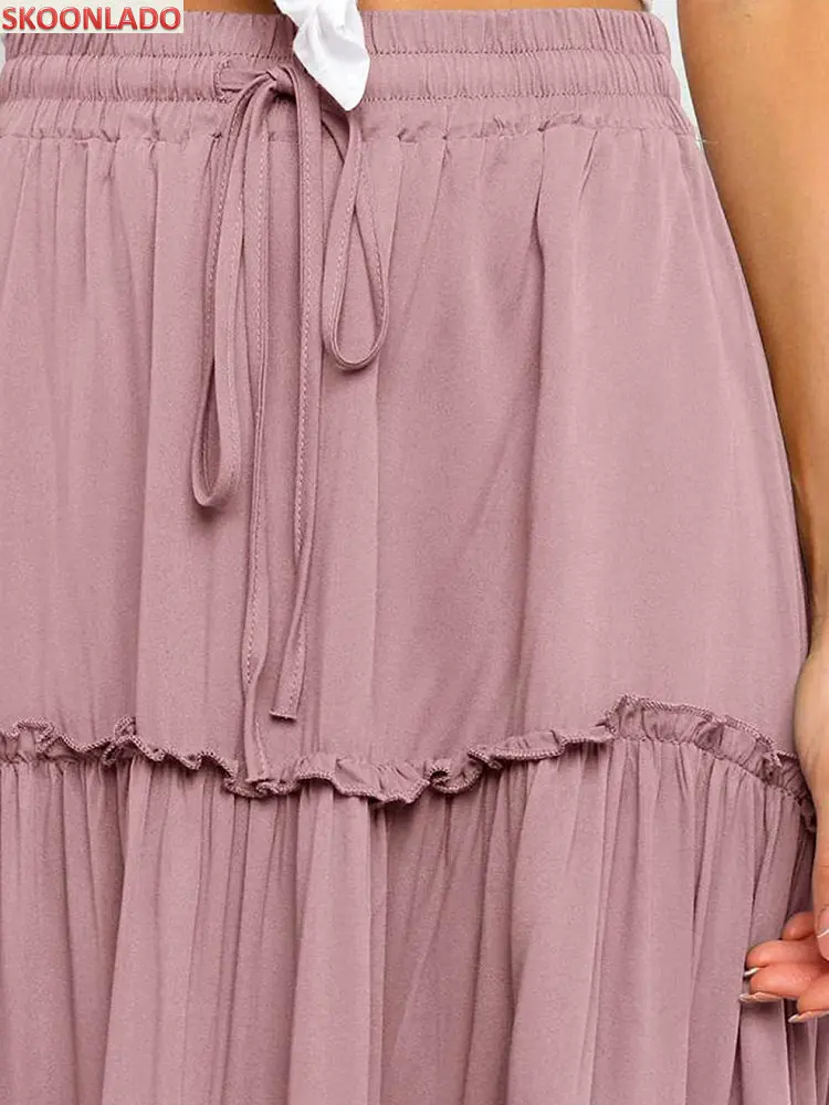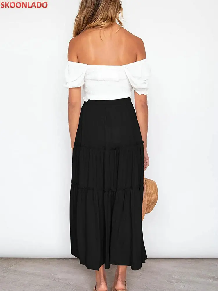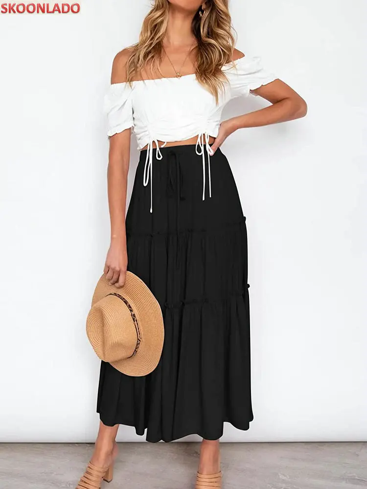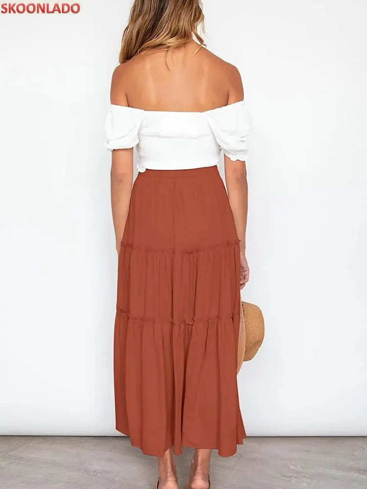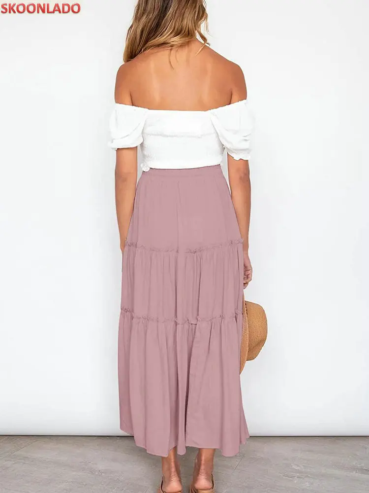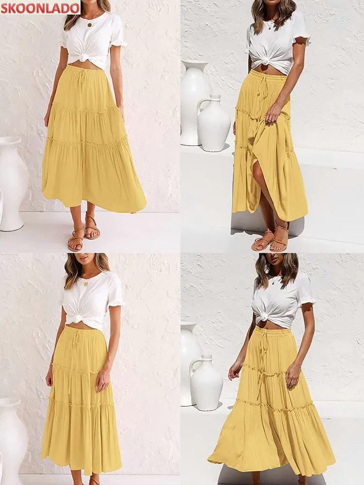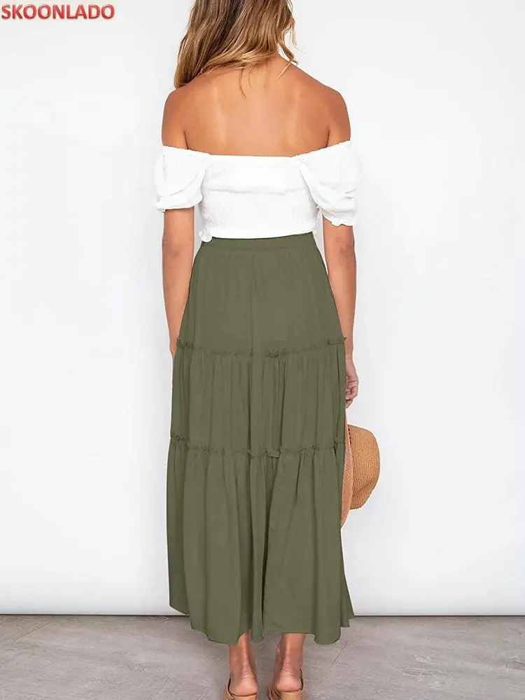 Newest Women High Waist Midi Skirt Boho A-Line Pleated Flowy Summer Skirts