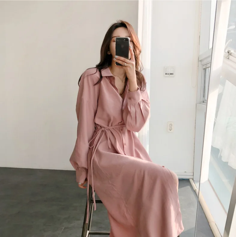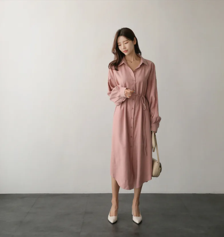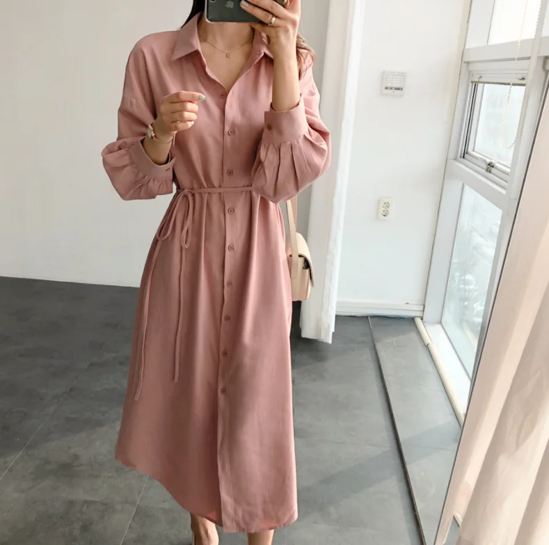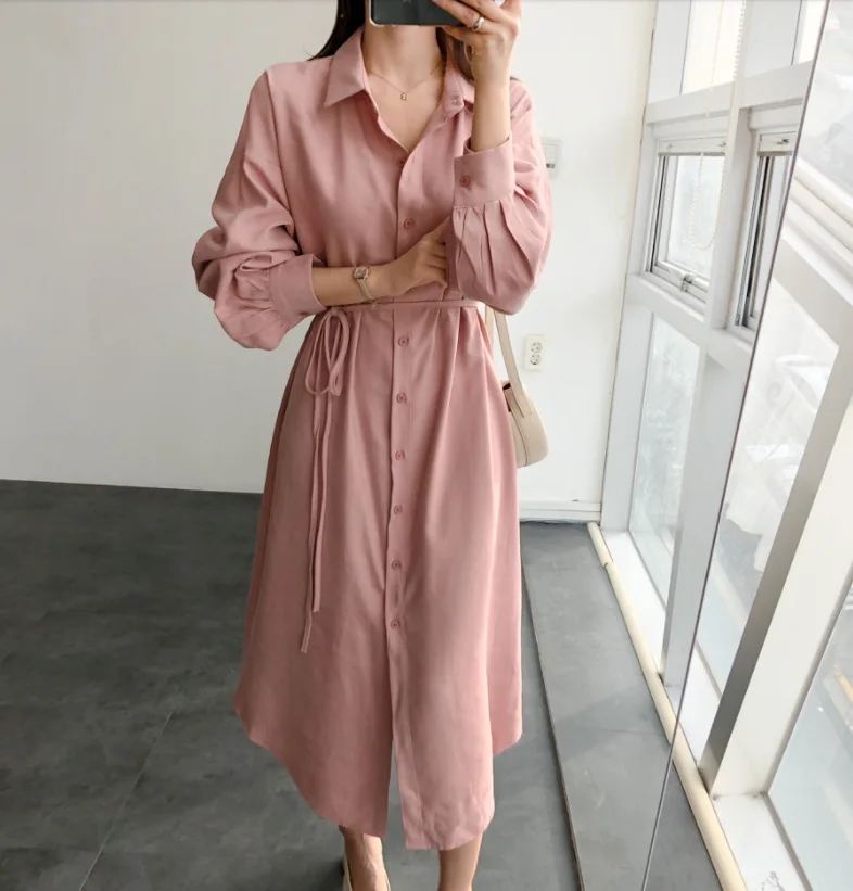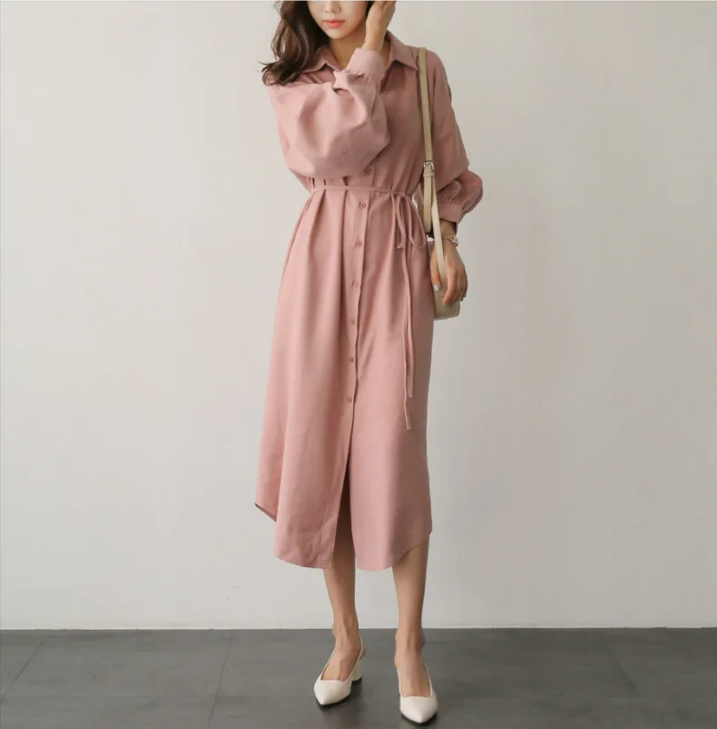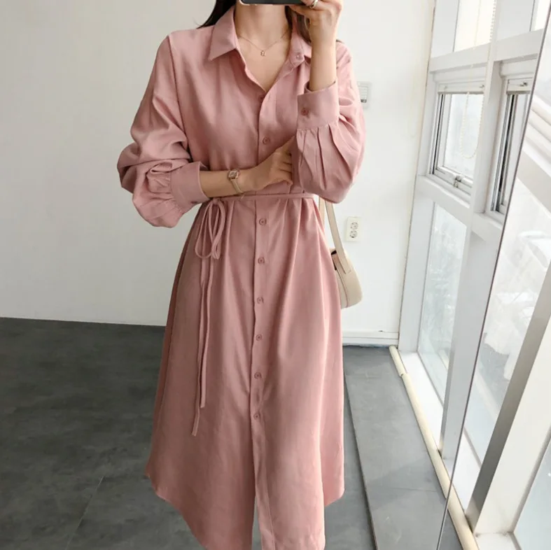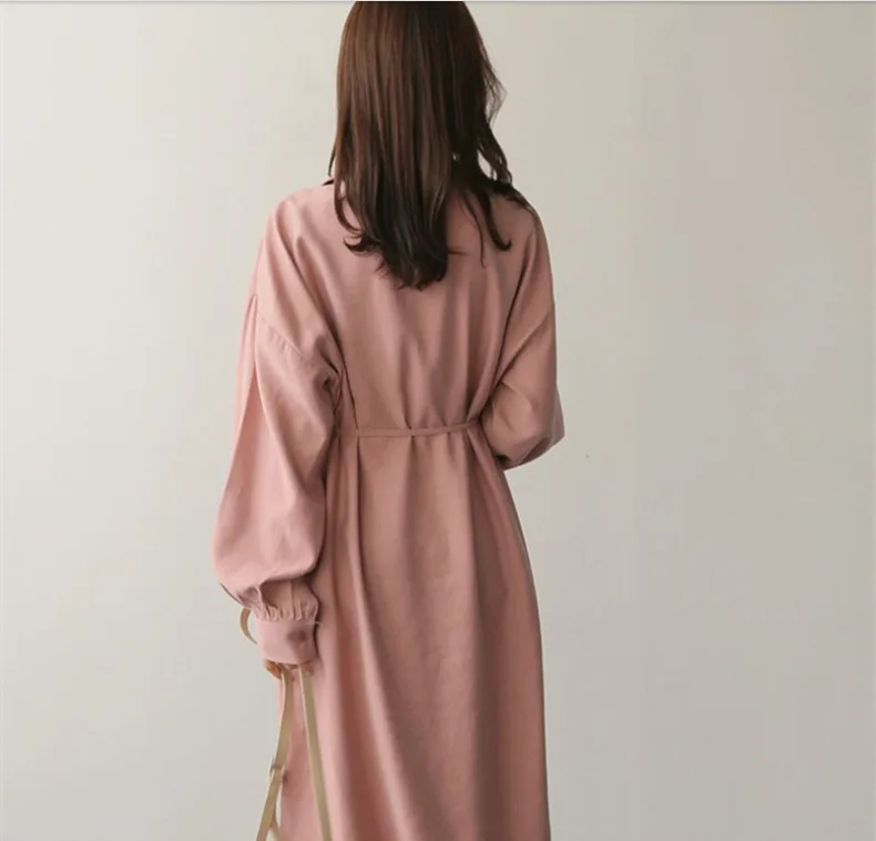 Newest Women'S V-neck Pink Long Drawstring Cuffs Buttons Belted Casual Loose Long Dress Solid Color