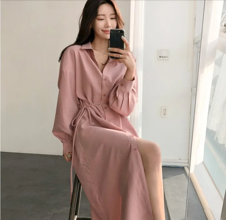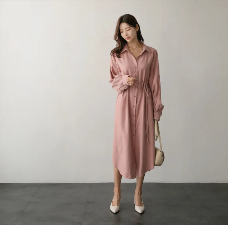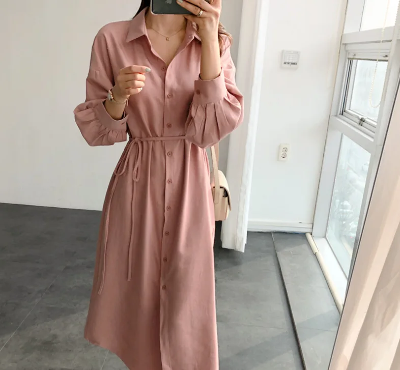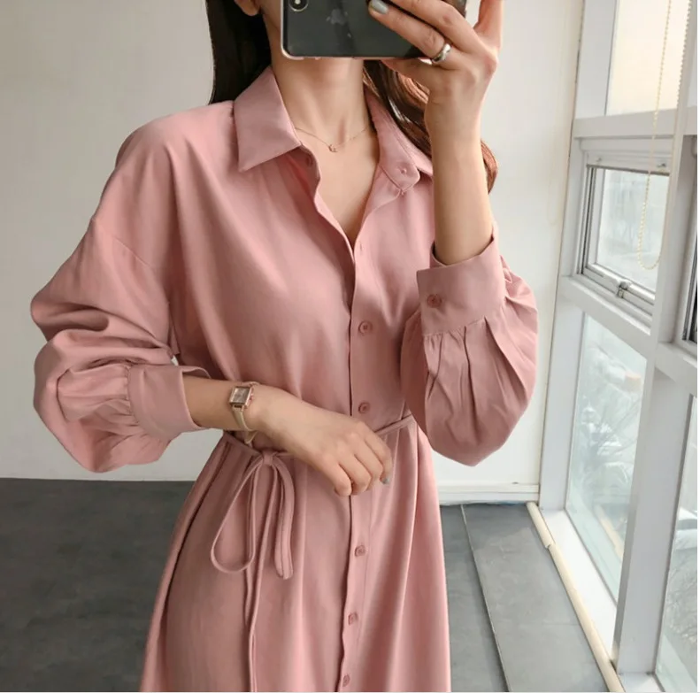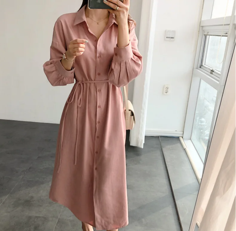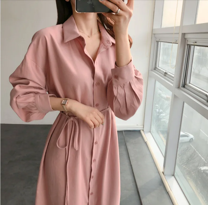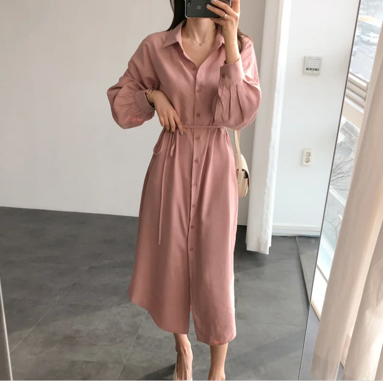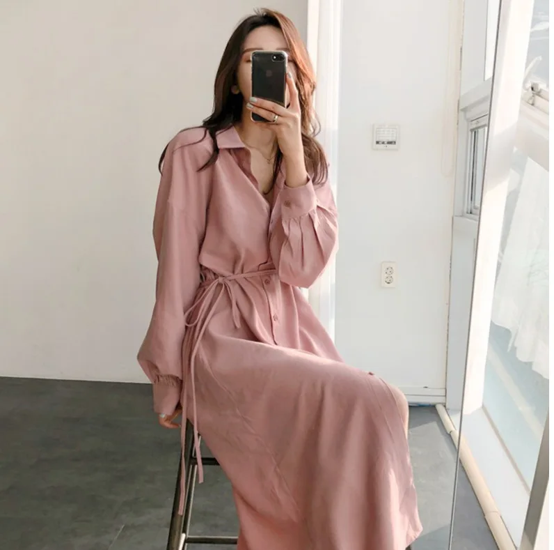 Newest Women'S V-neck Pink Long Drawstring Cuffs Buttons Belted Casual Loose Long Dress Solid Color