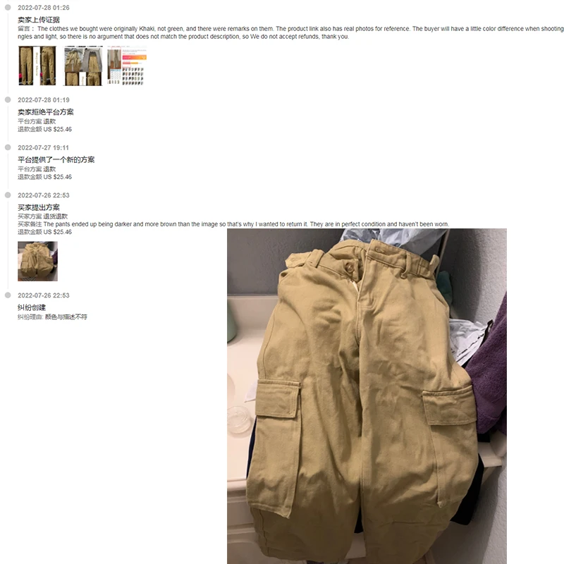 Dear, the following is the dispute filed by the buyer after receiving the package. The color does not match the description. The real object is khaki, not green. The following is the real object of the package received by the buyer. Before placing an order, please confirm that you want to get this color of pants