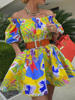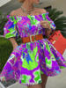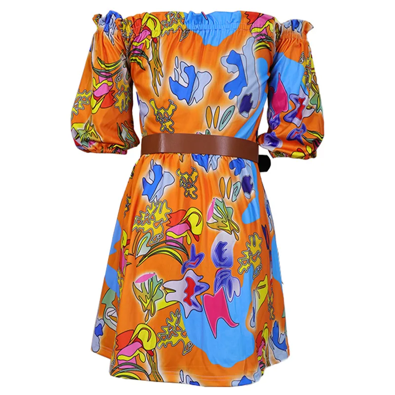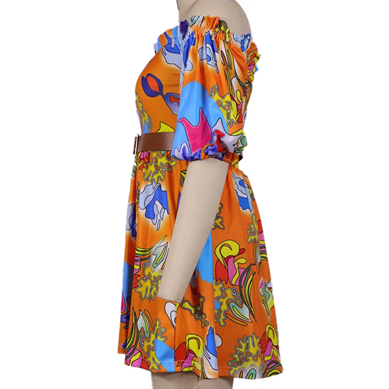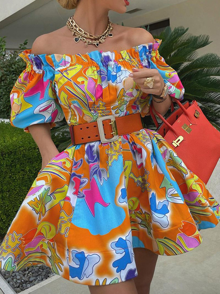 Off Shoulder Frill Hem Allover Print Dress with Belt Women Slash Neck Sweet Mini Dress