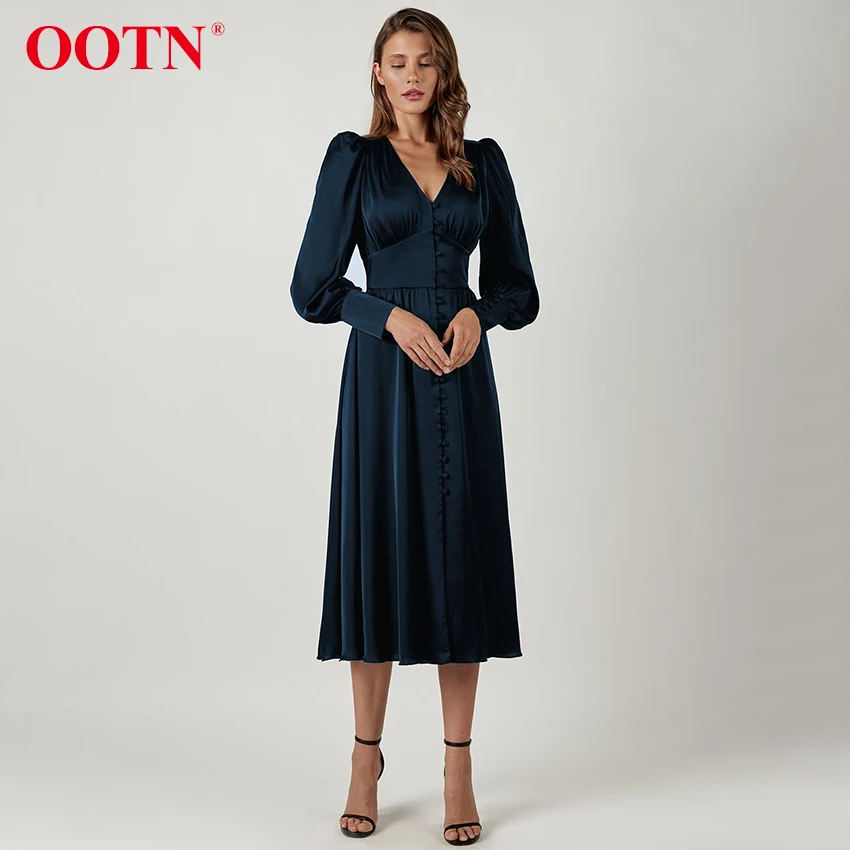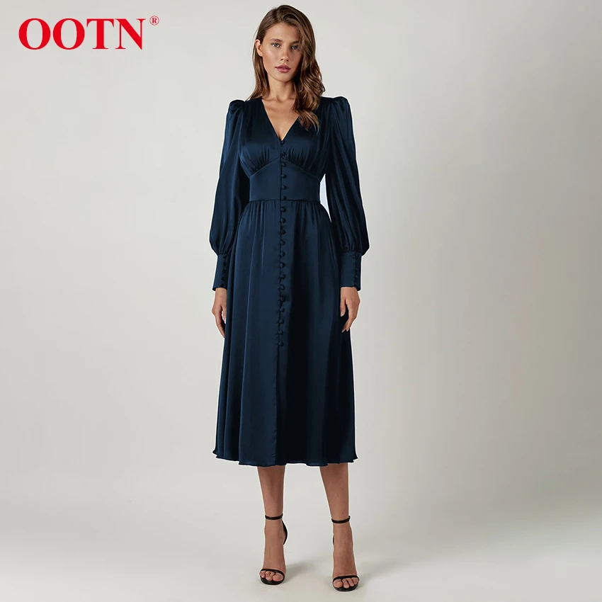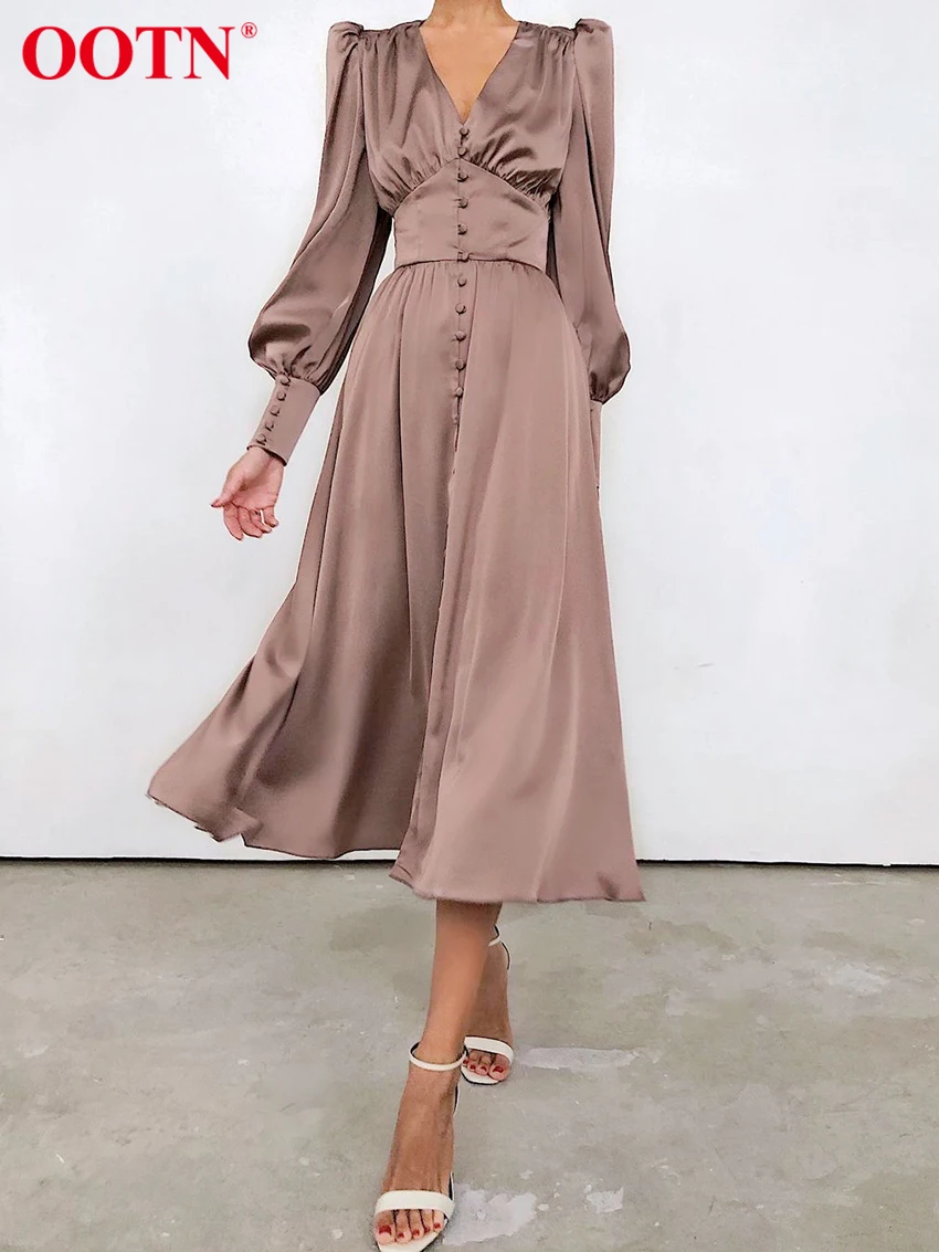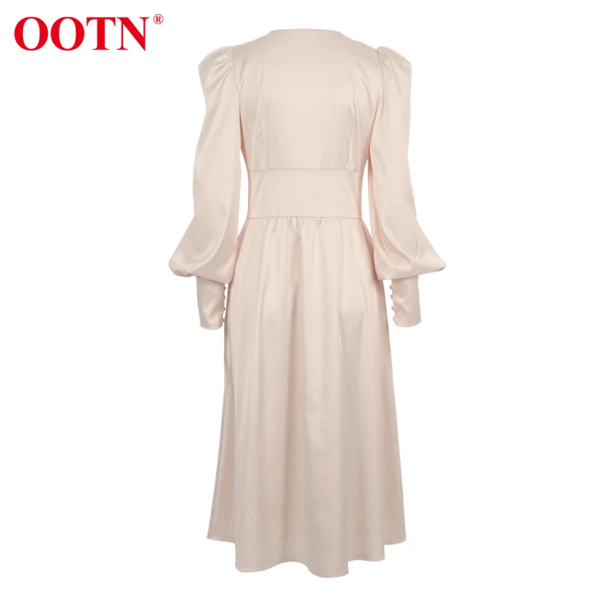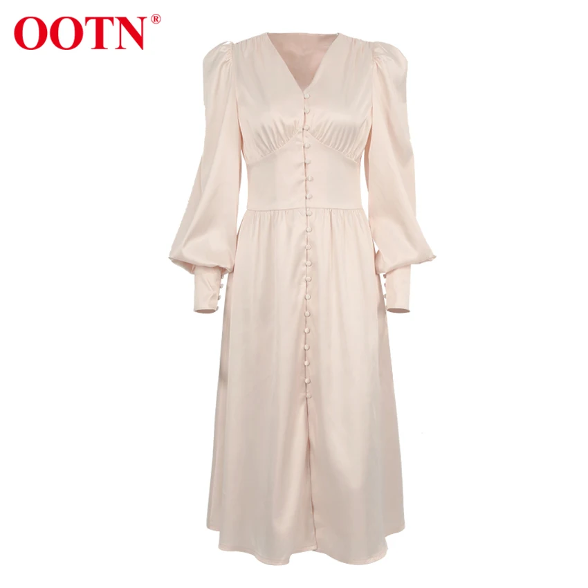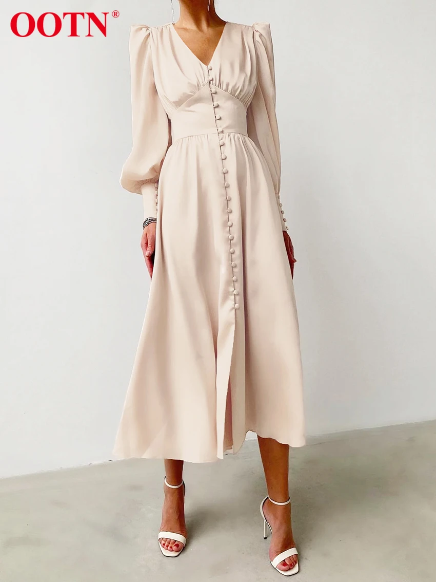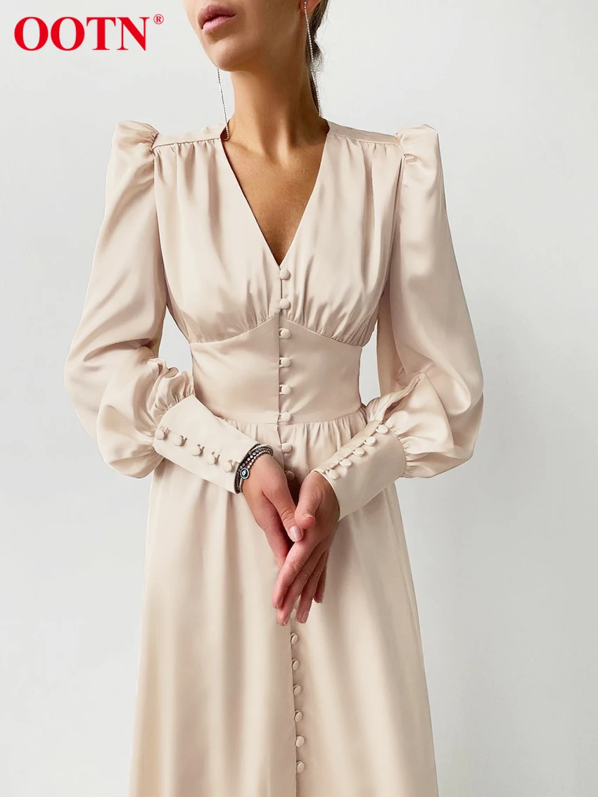 OOTN White Single Breasted Elegant Dress For Women Party Robe High Waist Satin Long Dress Chic Midi Dresses Lantern Sleeve 2022