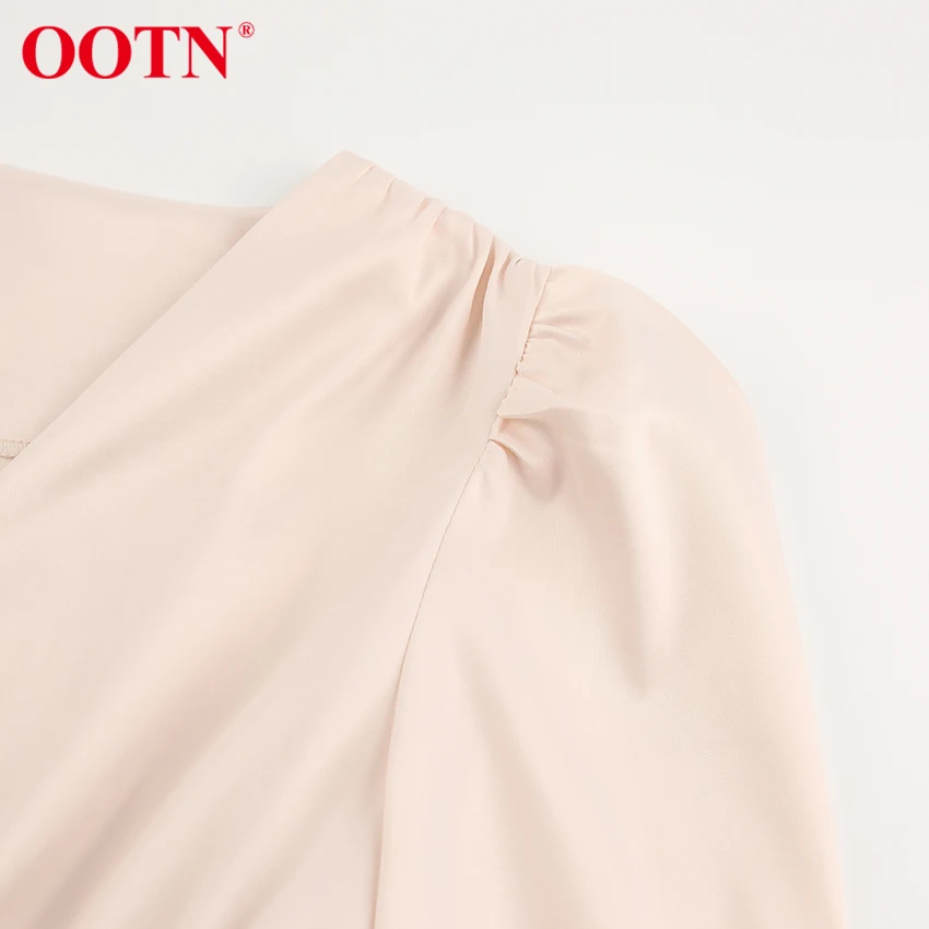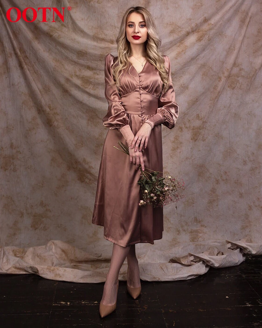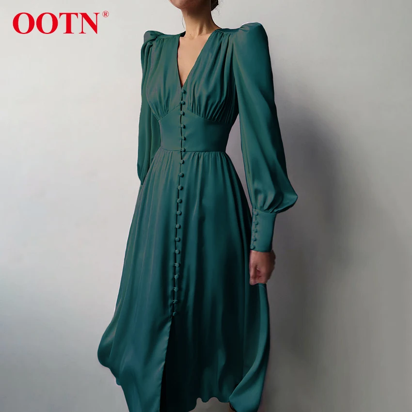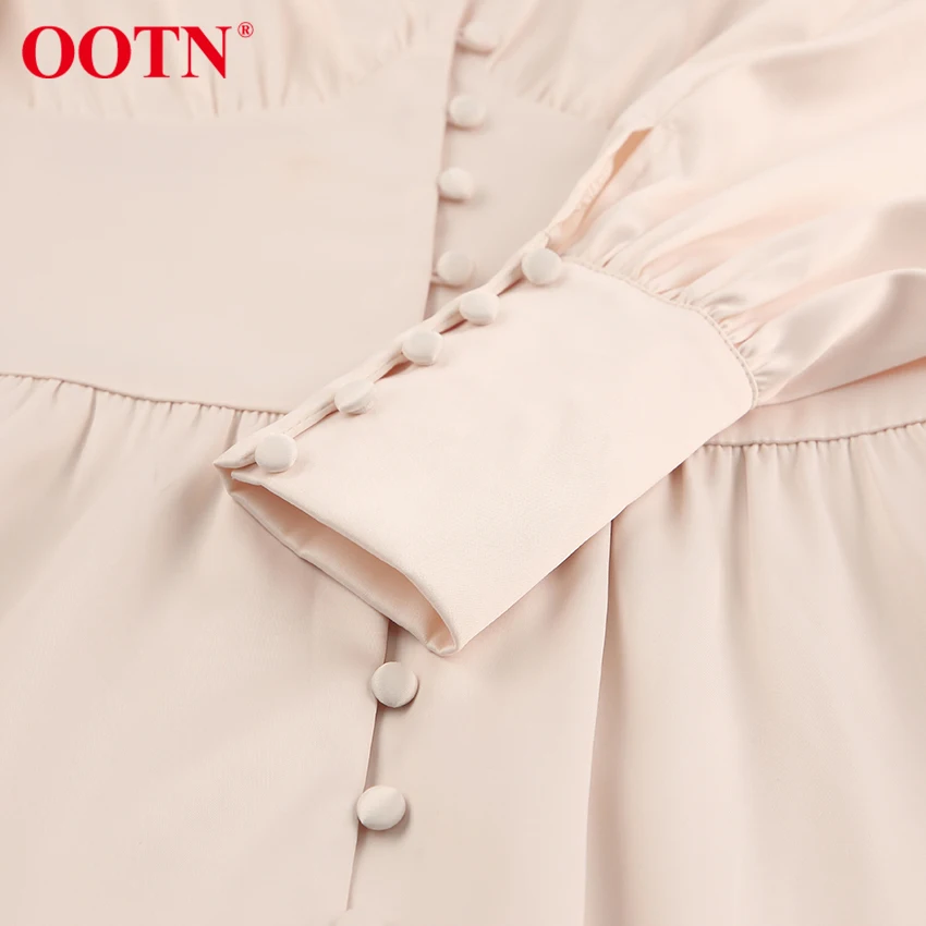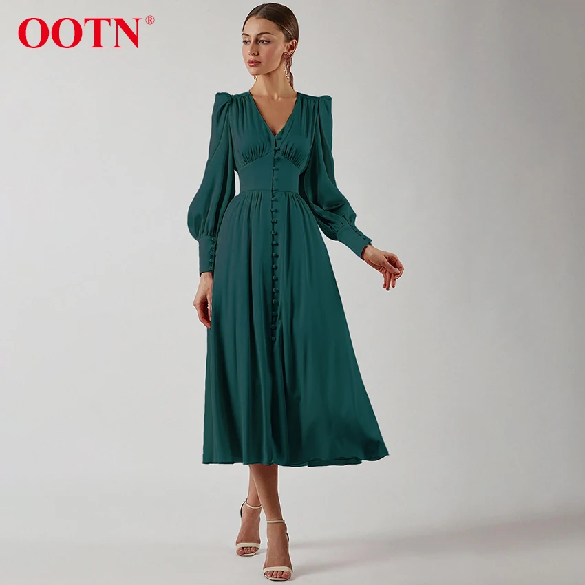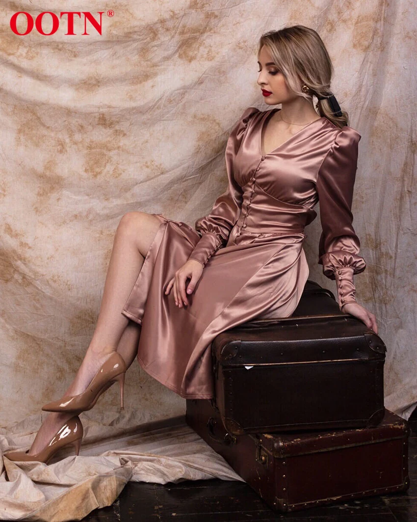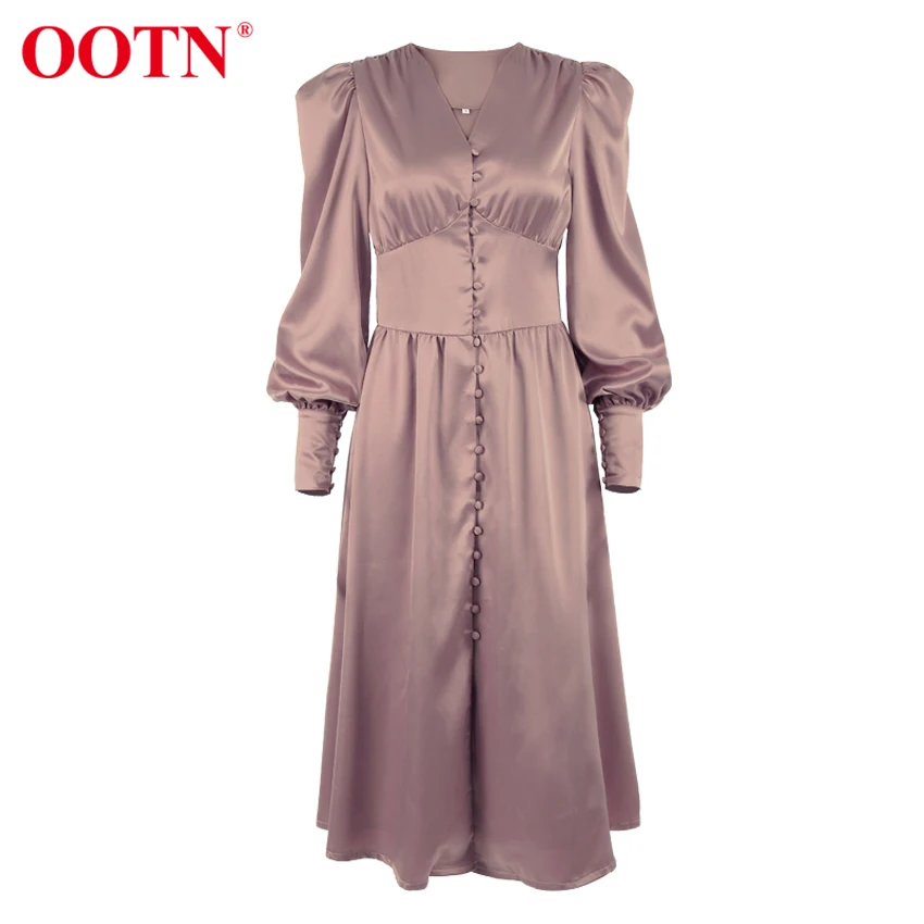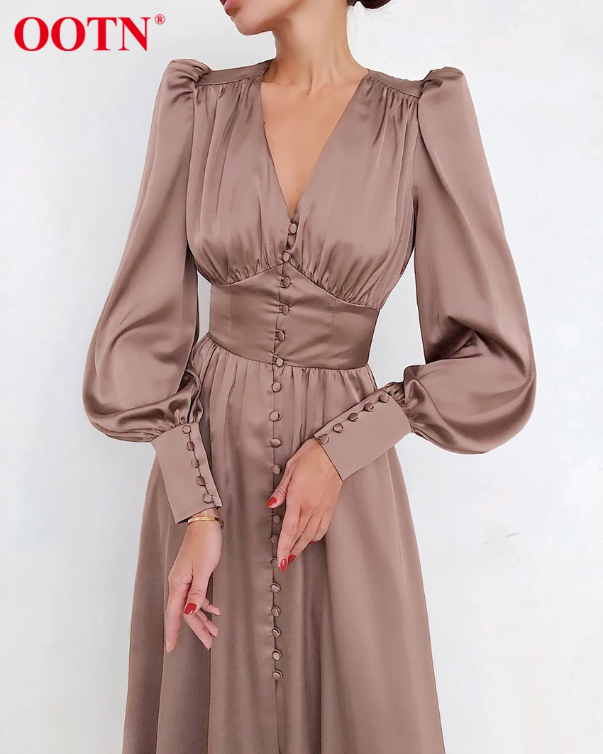 OOTN White Single Breasted Elegant Dress For Women Party Robe High Waist Satin Long Dress Chic Midi Dresses Lantern Sleeve 2022