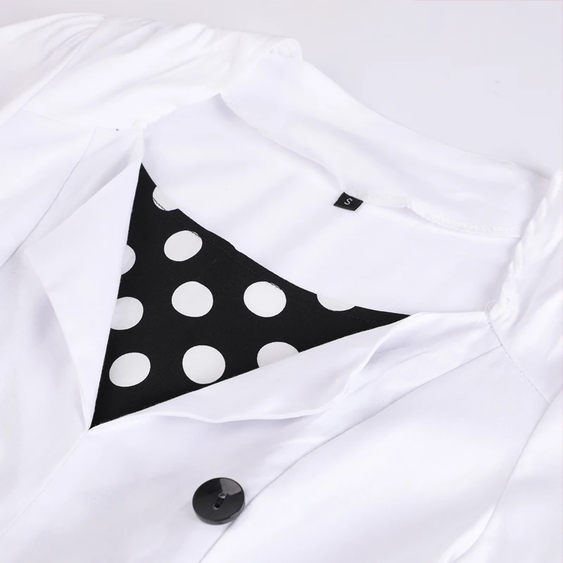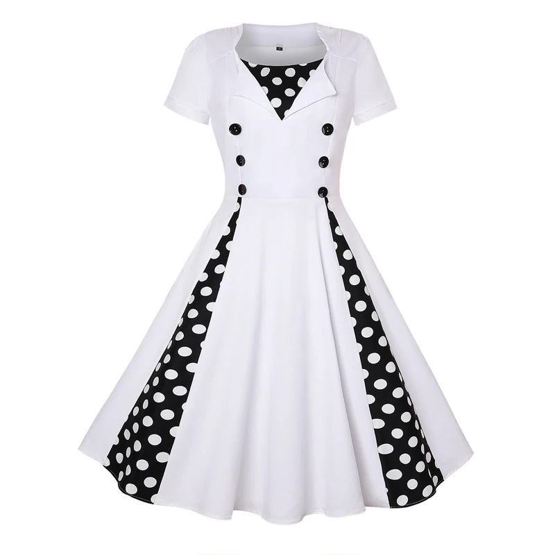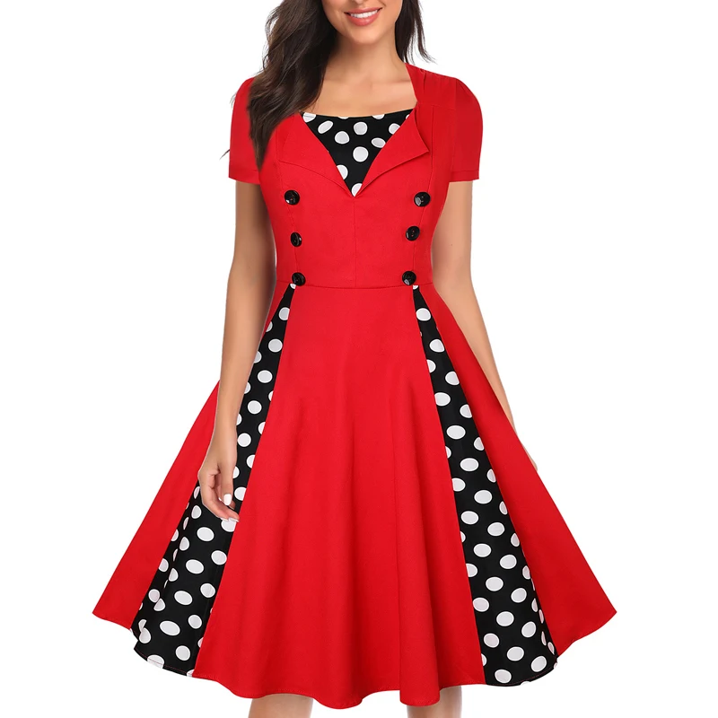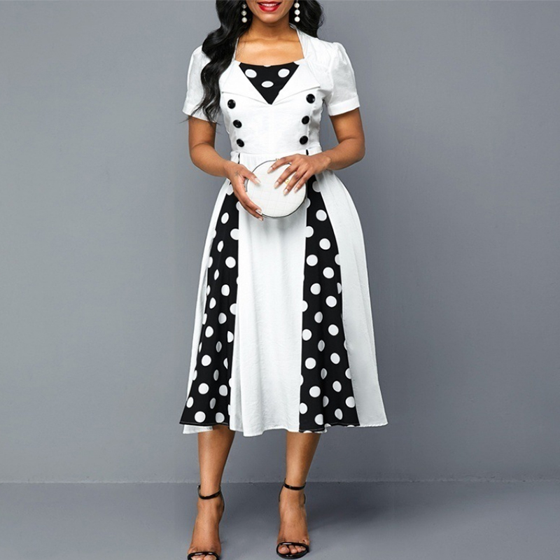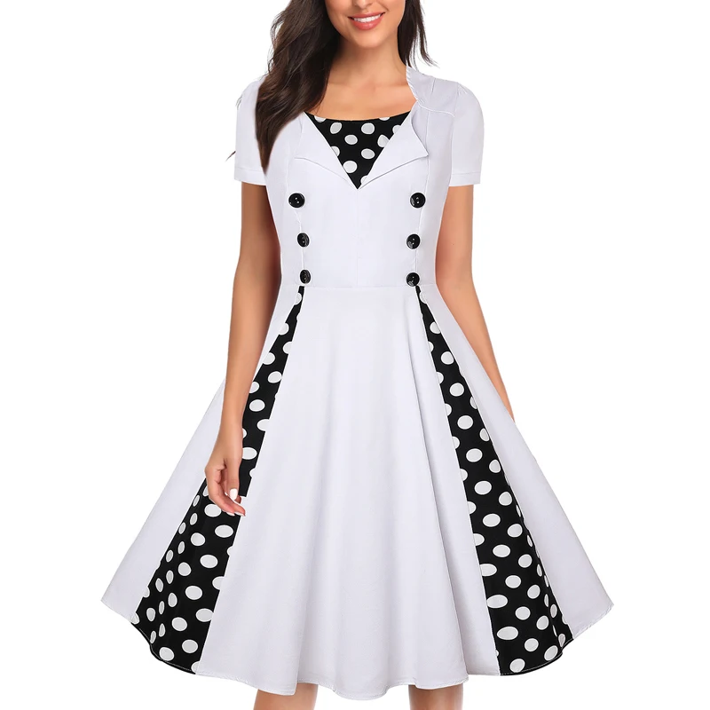 OTEN 2020 Summer Woman Dresses Vintage Patchwork Button Polka Dots Hepburn Style A-Line Printed Retro 50S 60S Swing Party Female