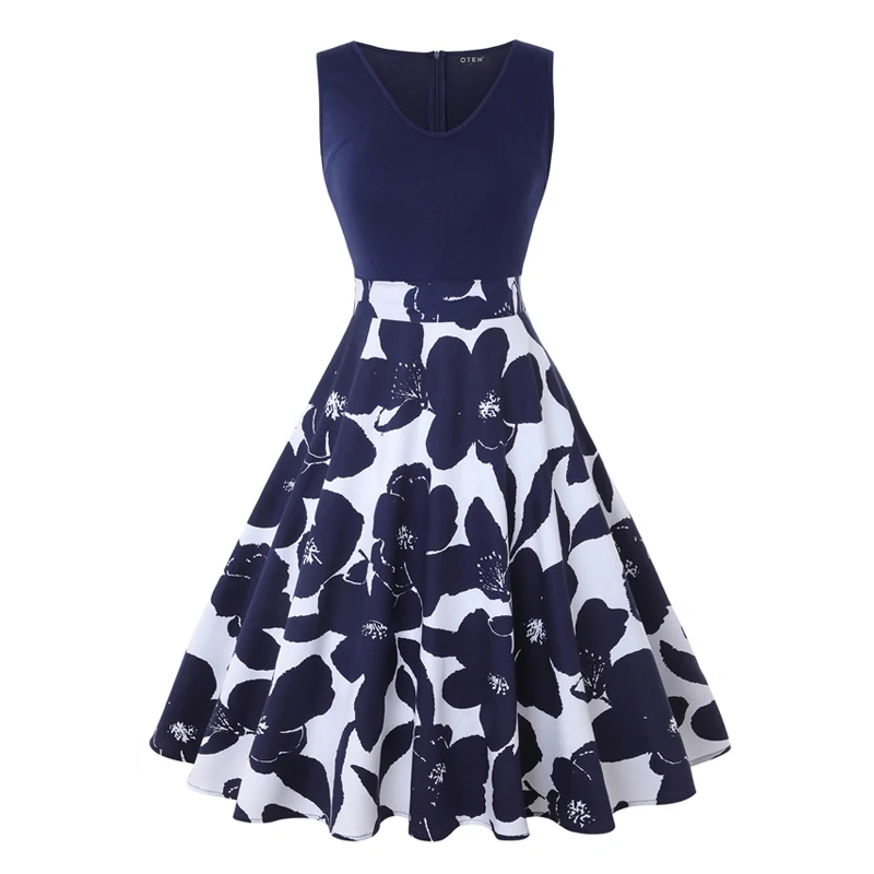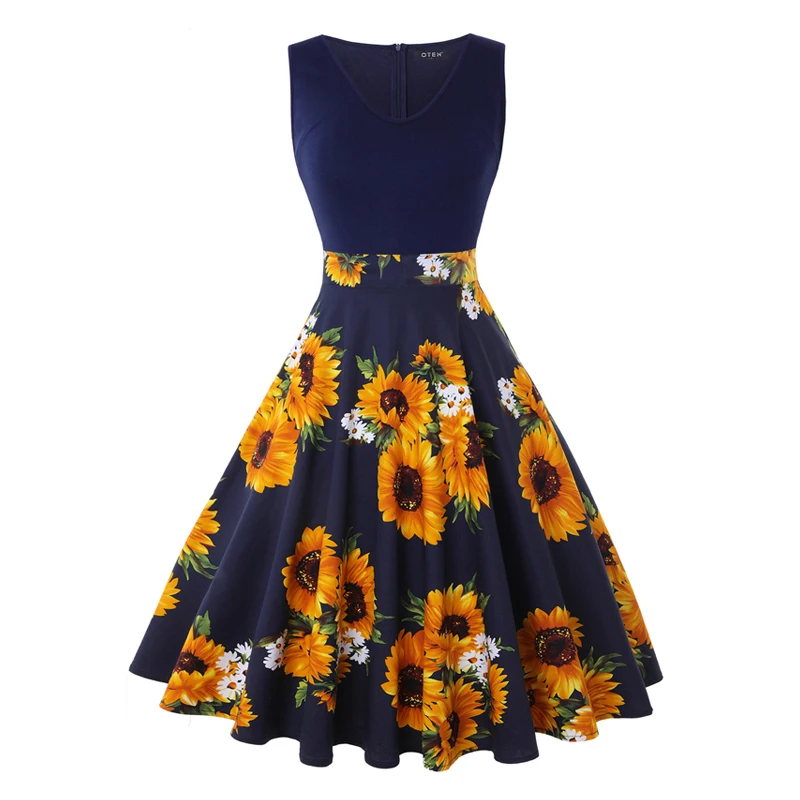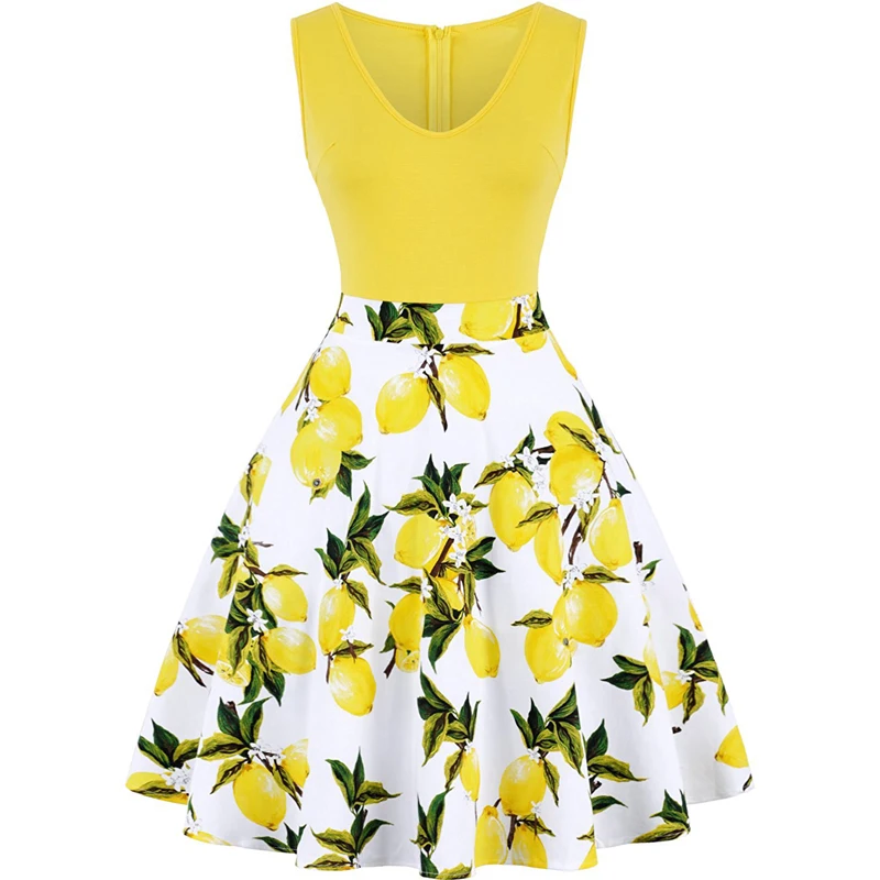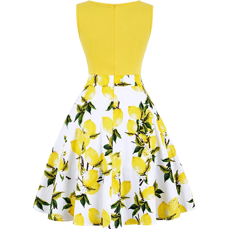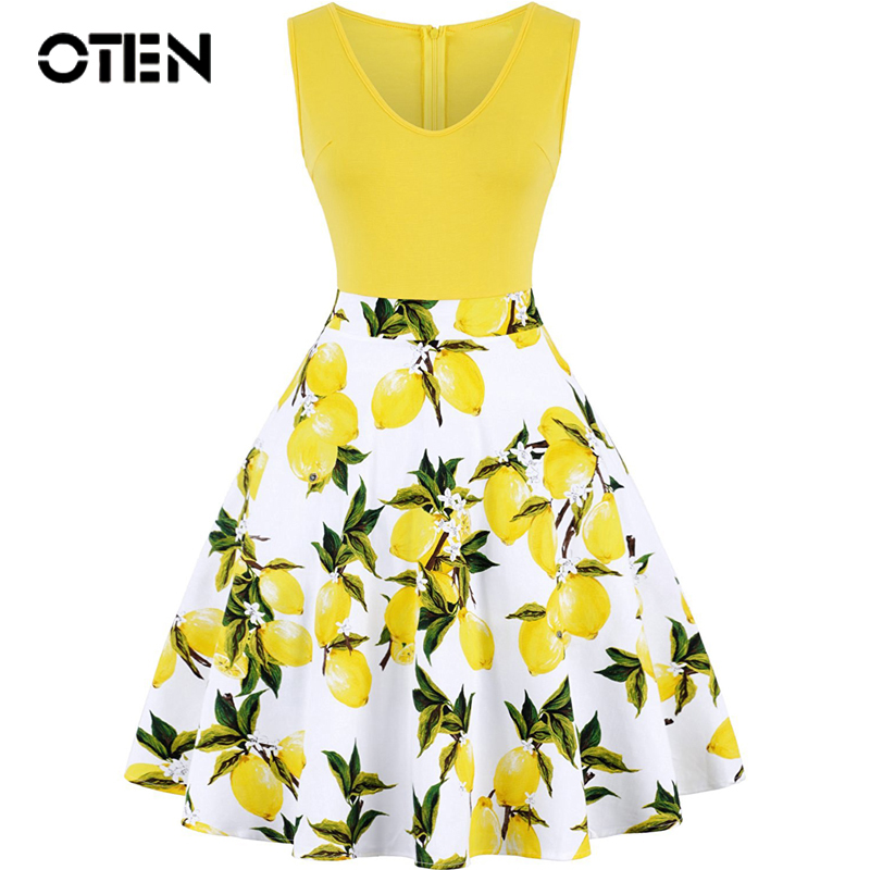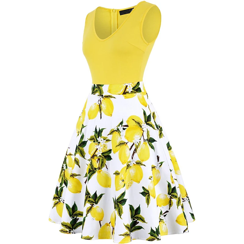 OTEN Women Sleeveless Summer Lemon Flower Printed V Neck contrast color A Line Casual Party lady dresses midi plus size feminino