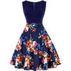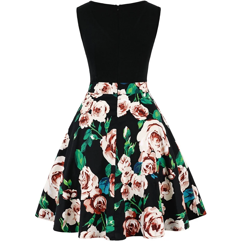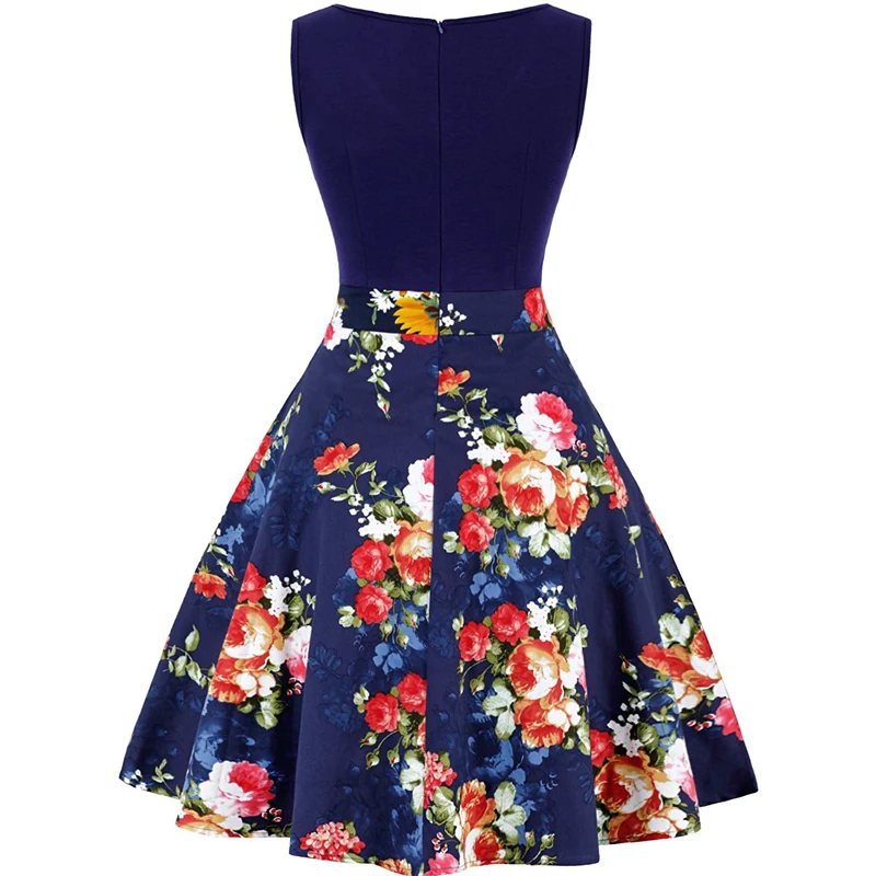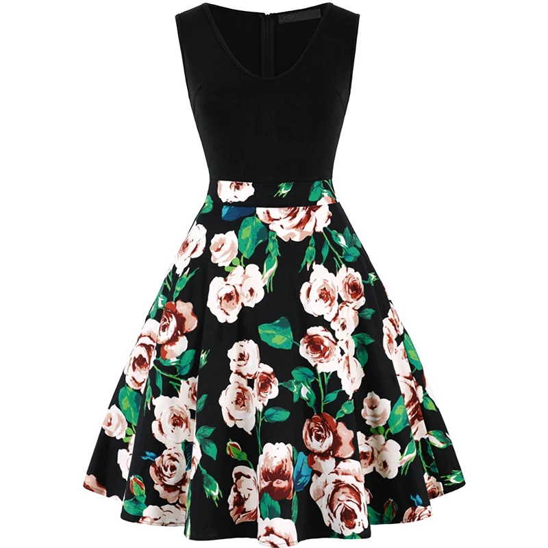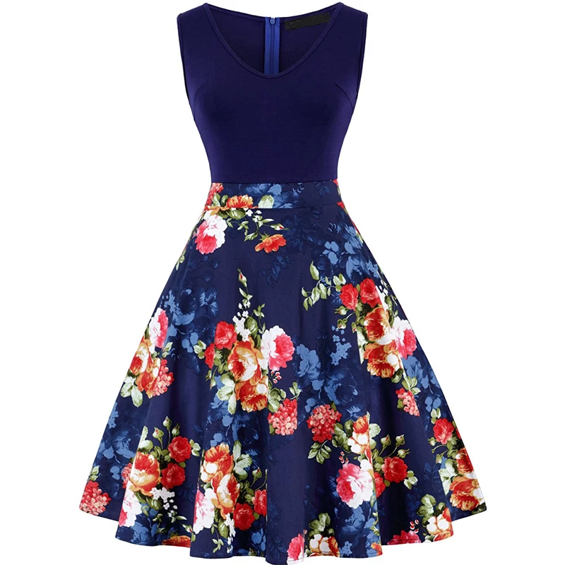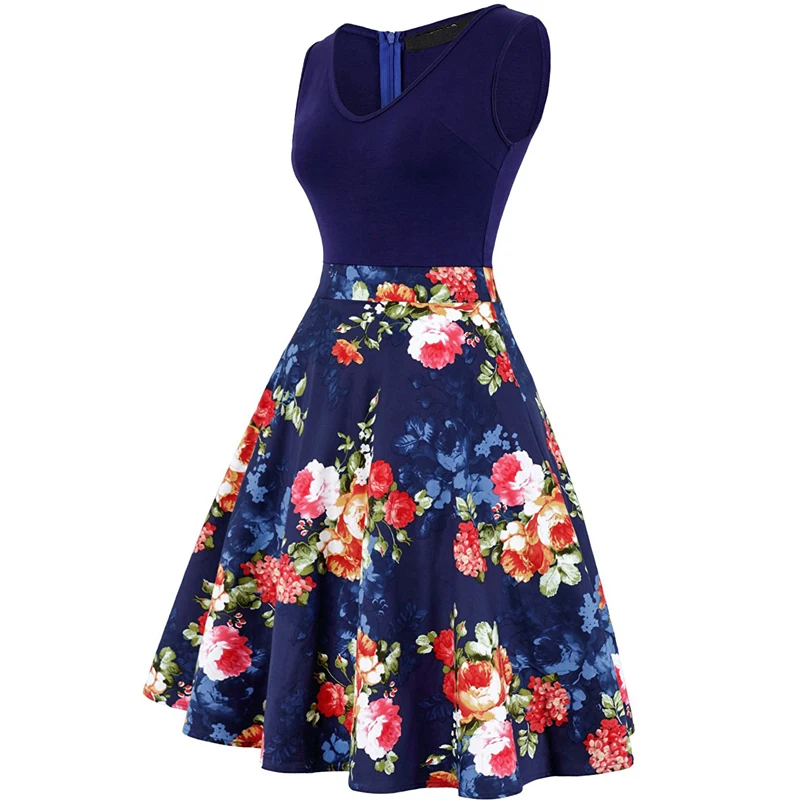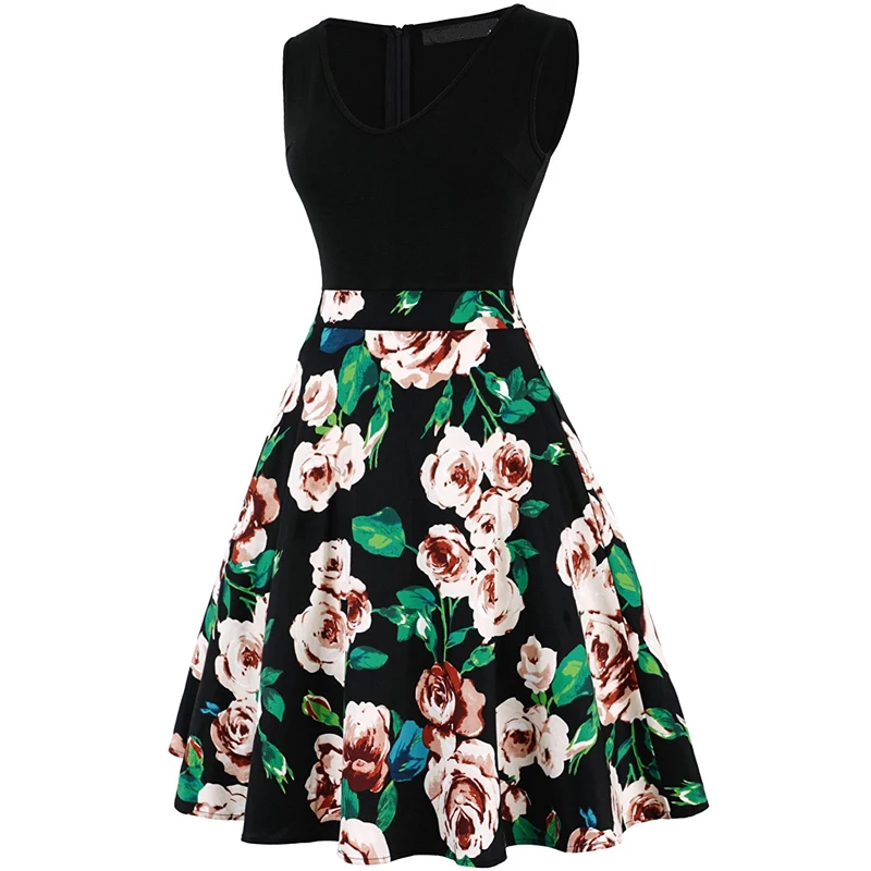 OTEN Women Sleeveless Summer Lemon Flower Printed V Neck contrast color A Line Casual Party lady dresses midi plus size feminino