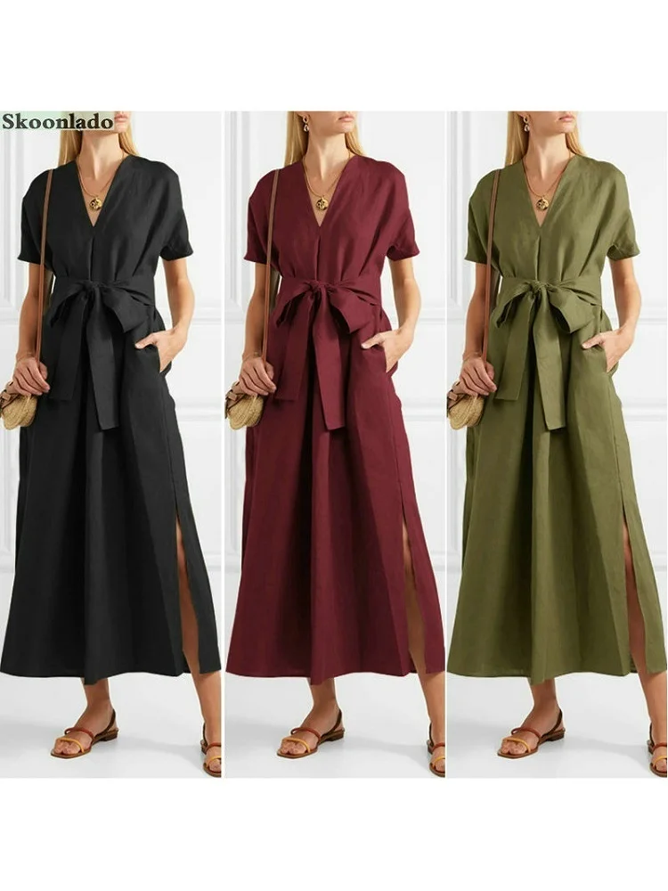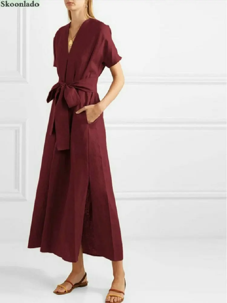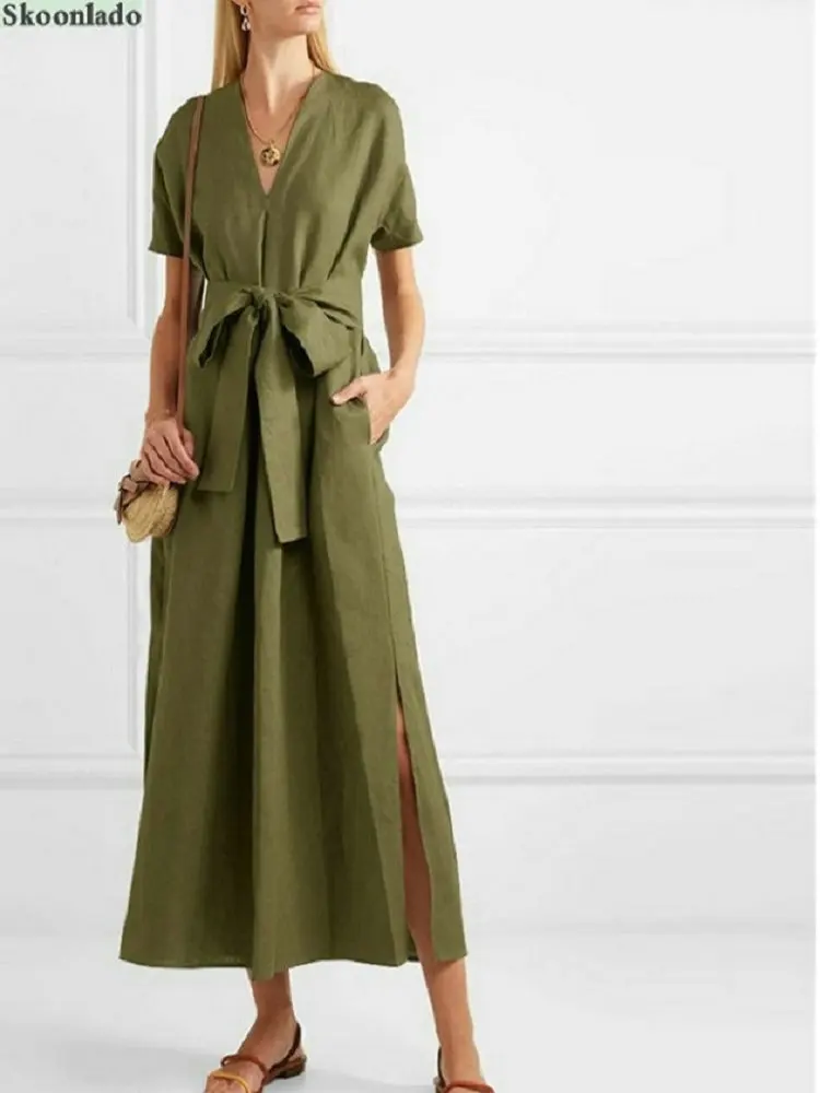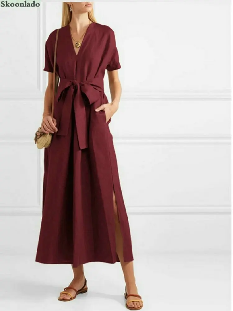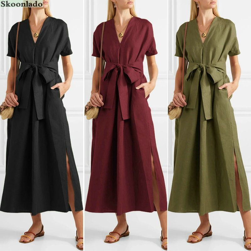 Overseas Size Women Summer Cotton Linen Long Dresses Good Quality Elegant Classic Female Linen Dress Belt Fashion Female Clothes