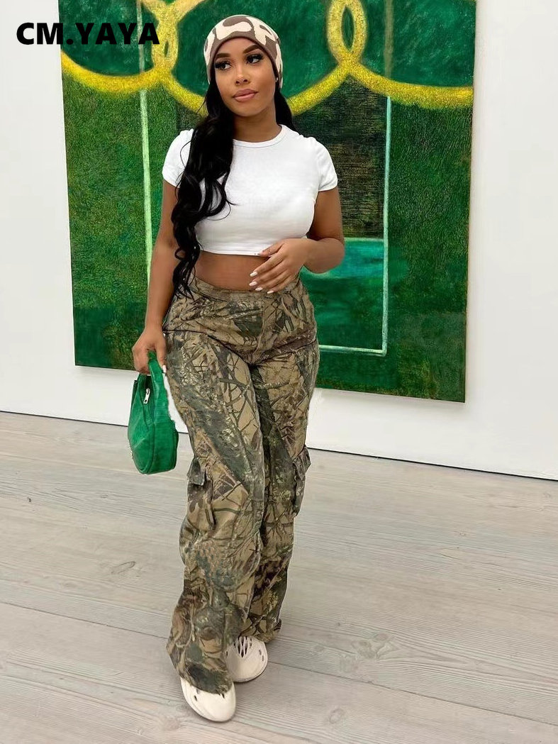 CM.YAYA Women Camouflage Straight Wide Leg Pocket Side Cargo Pants 2023 Summer Street Fashion Safari Style Trousers