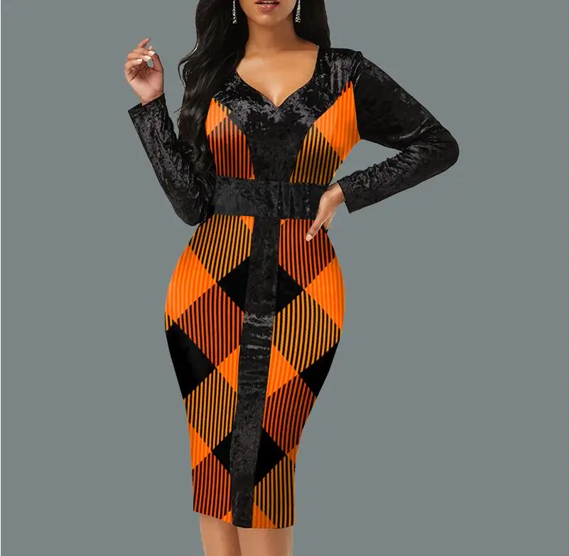 Party Dresses For Women 2021 Fashion Elegant Printed Bodycon Dress Autumn Vintage Sexy V Neck Long Sleeve Slim Work Dresses