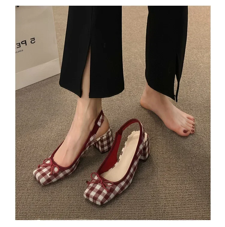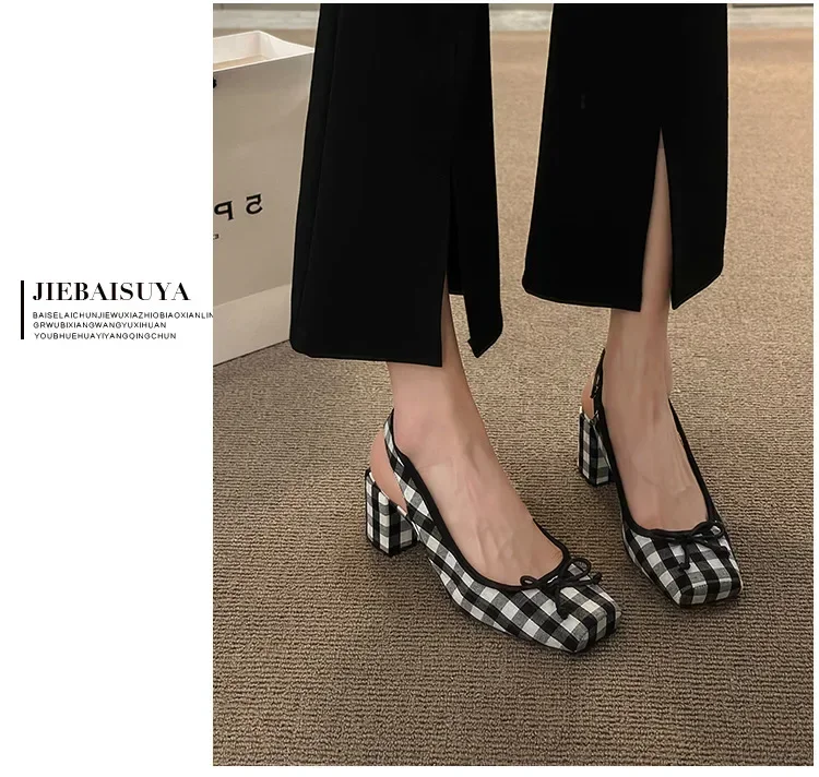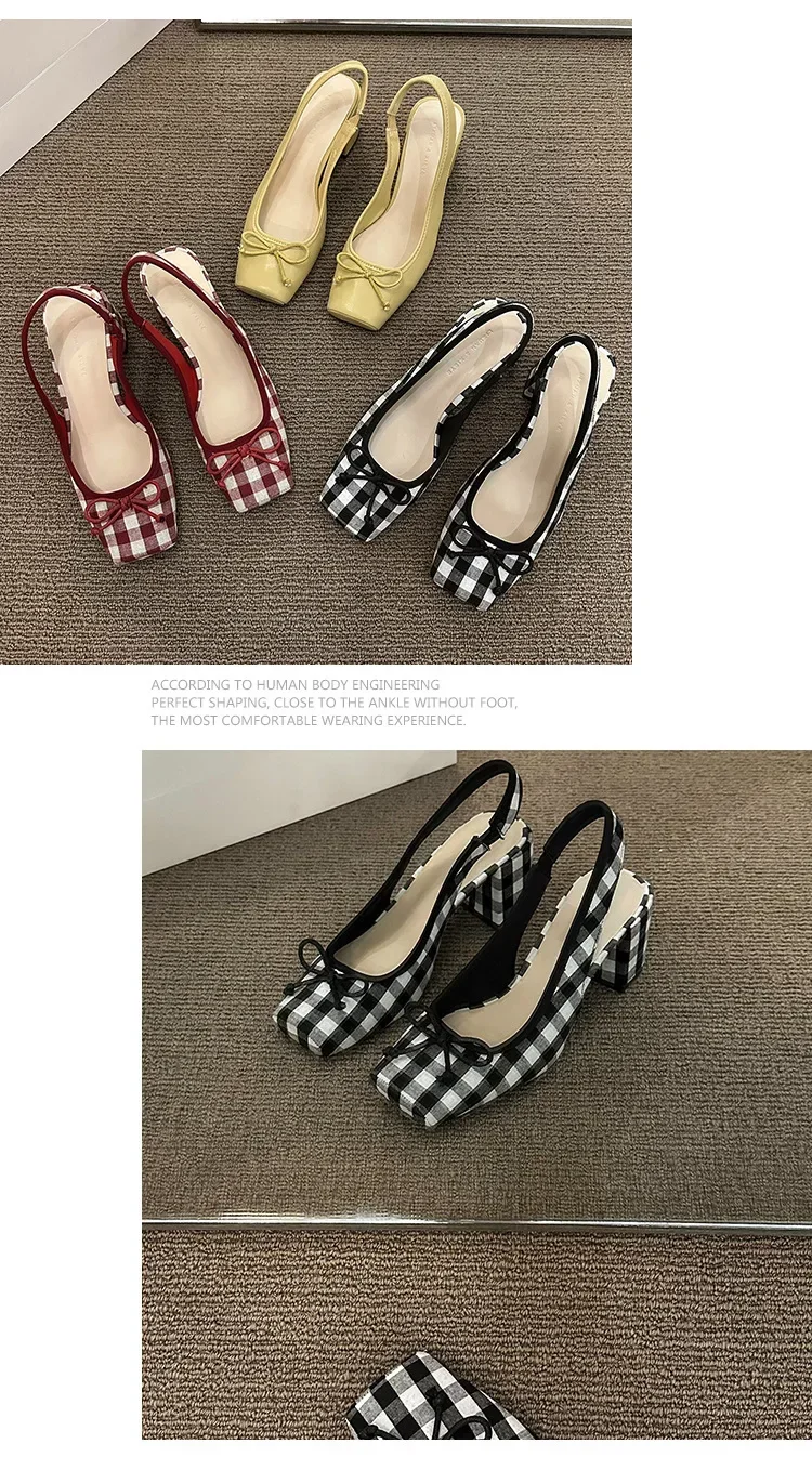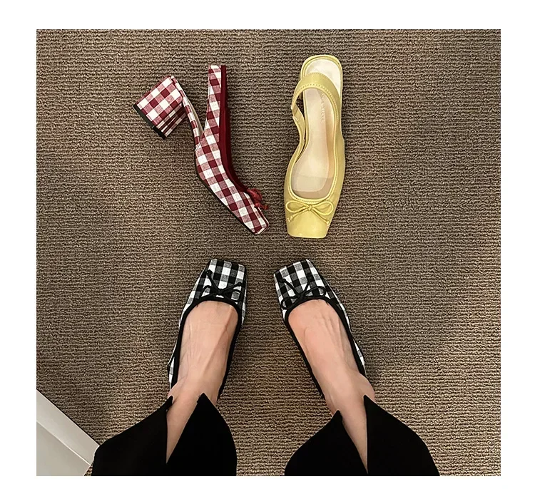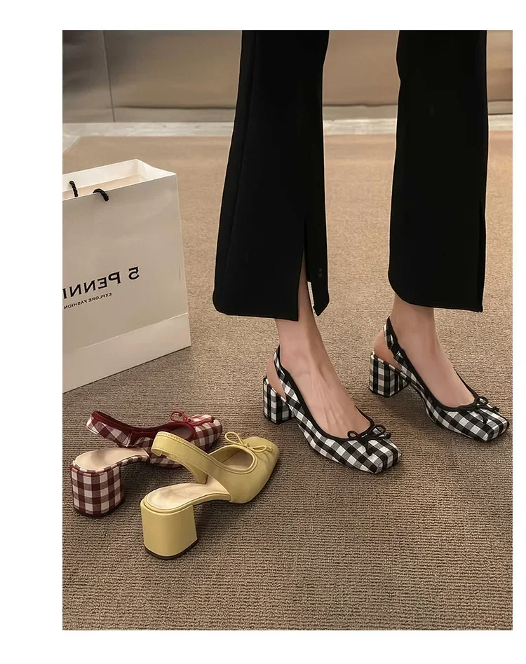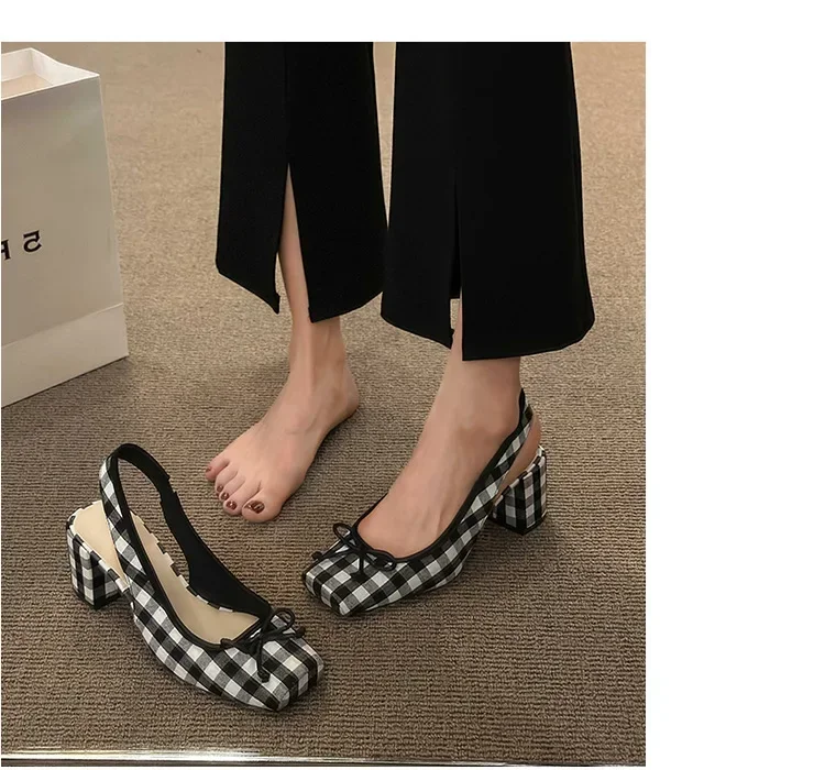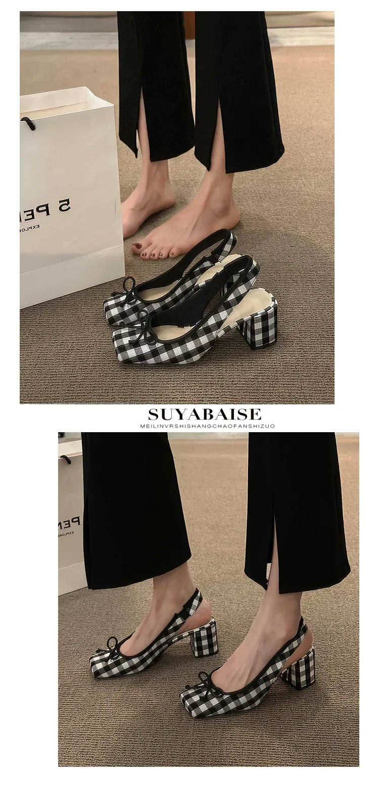 Plaid Square Toe Thick Heel Women Shoes 2023 New Bowknot Casual High Heel Sandals for Women Zapatos De Mujer Sandalias