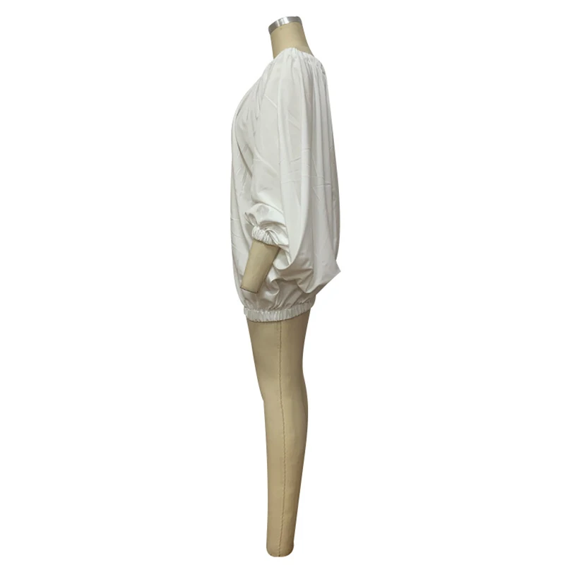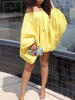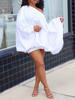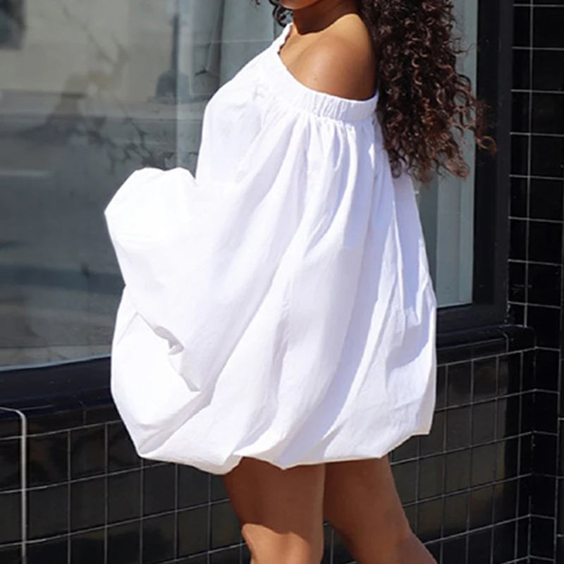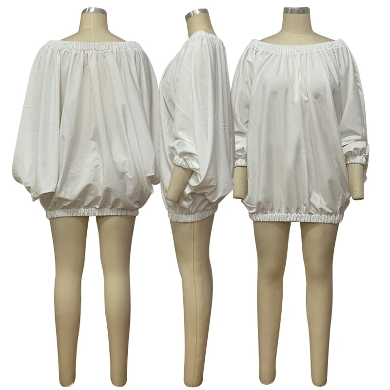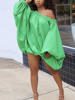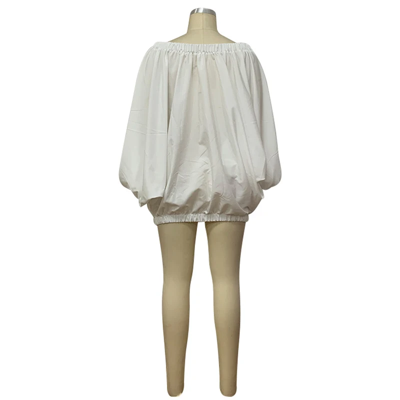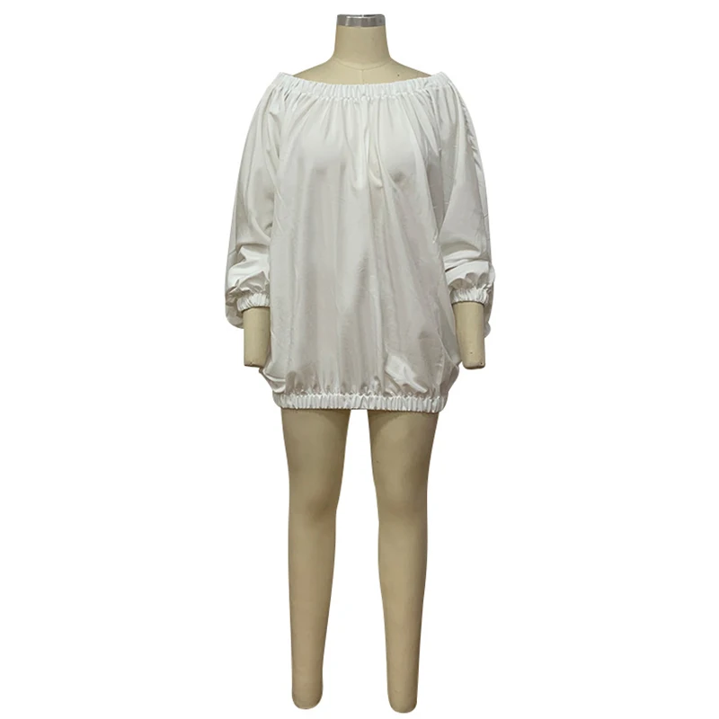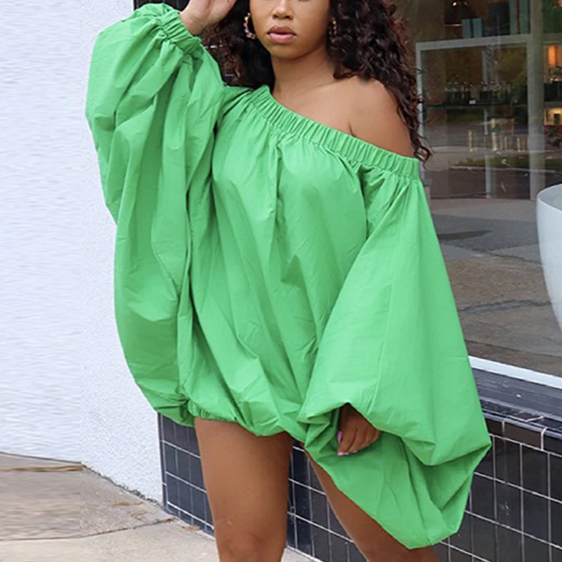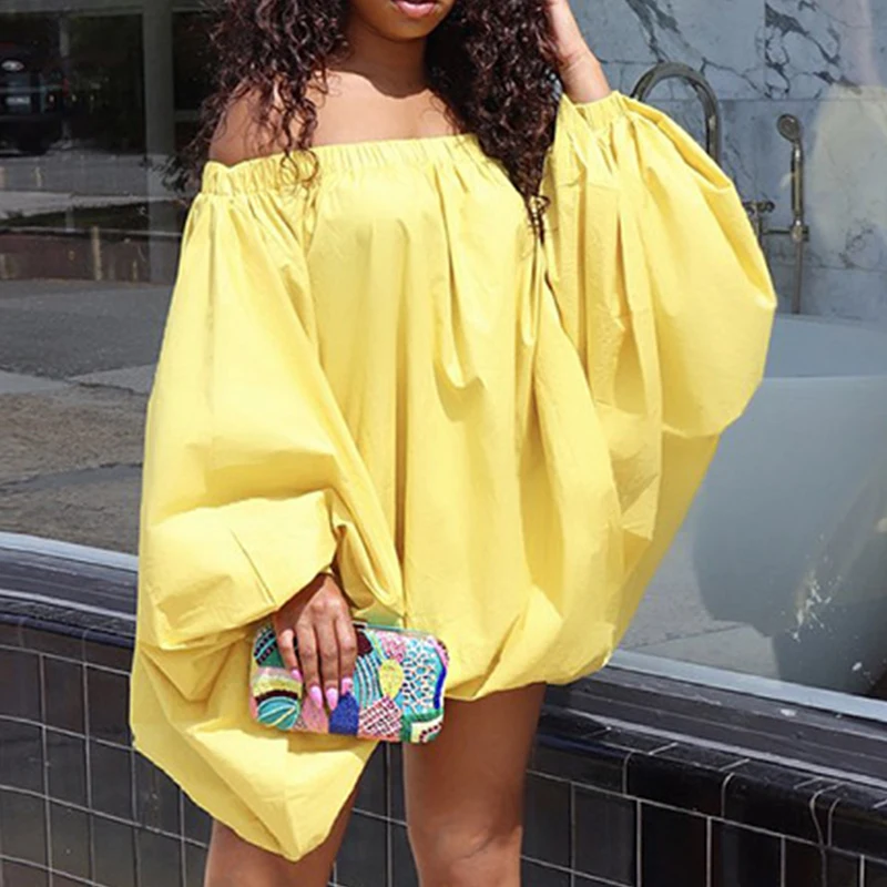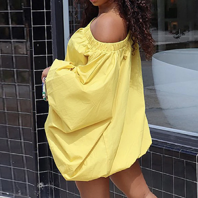 Plain Puffed Long Sleeve Casual Loose Mini Dress Women Slash Neck Dress