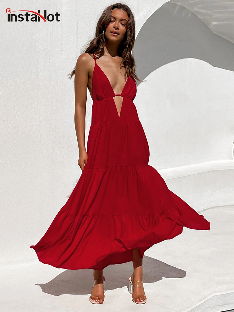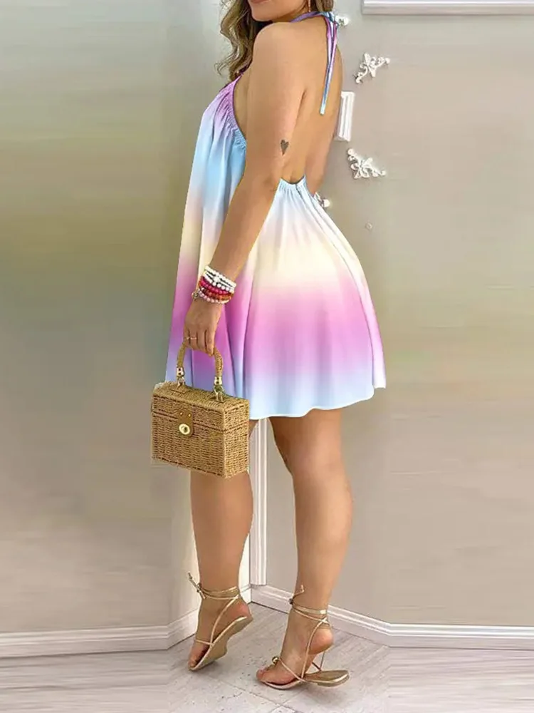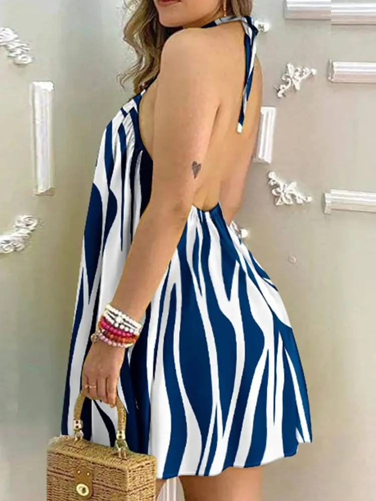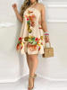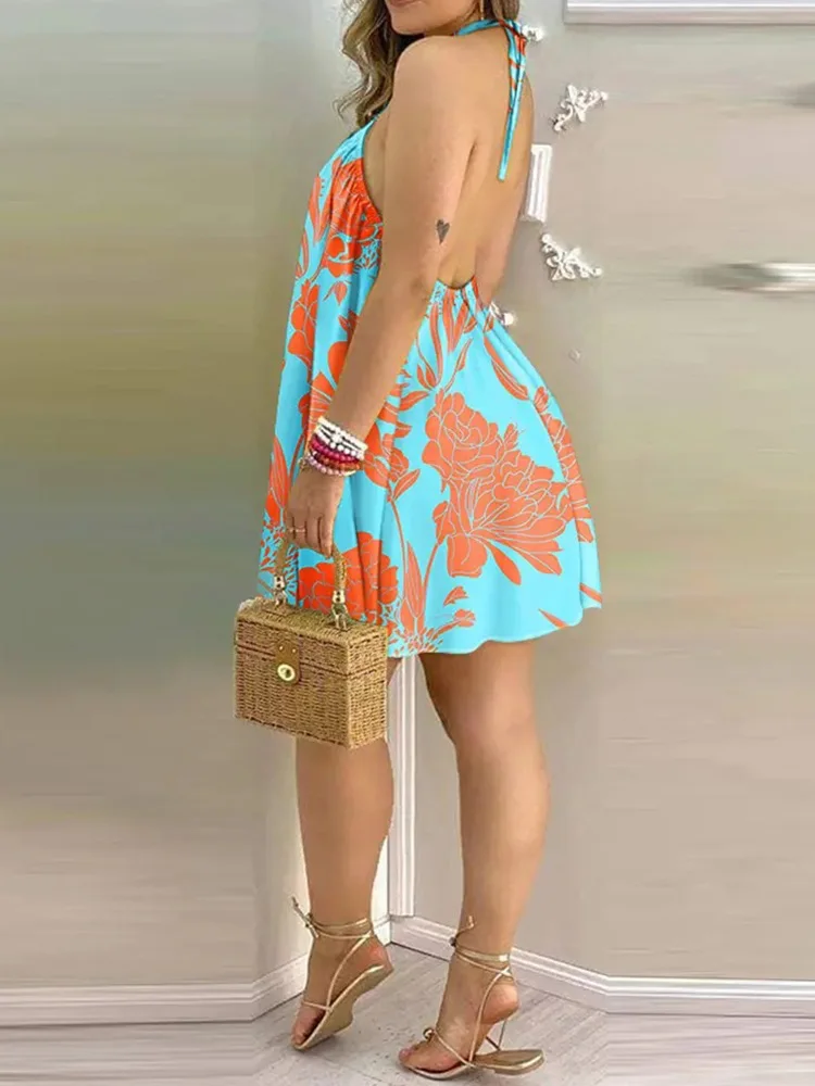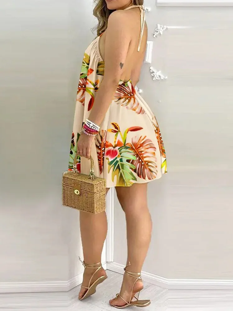 Plant Print Sexy Halter Backless Sleeveless Summer Dress Women