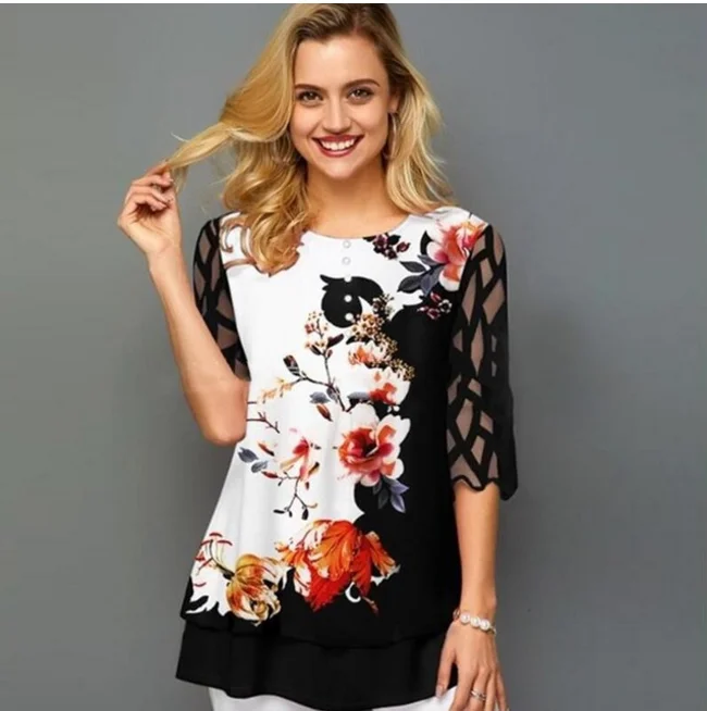 Plus Size 4xl 5XL Shirt Blouse Female 2020 Spring Summer New Tops O-neck Half Sleeve Lace Splice Print Boho Women shirt