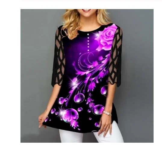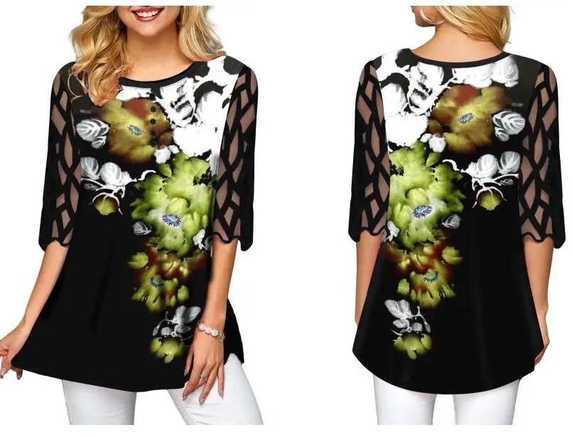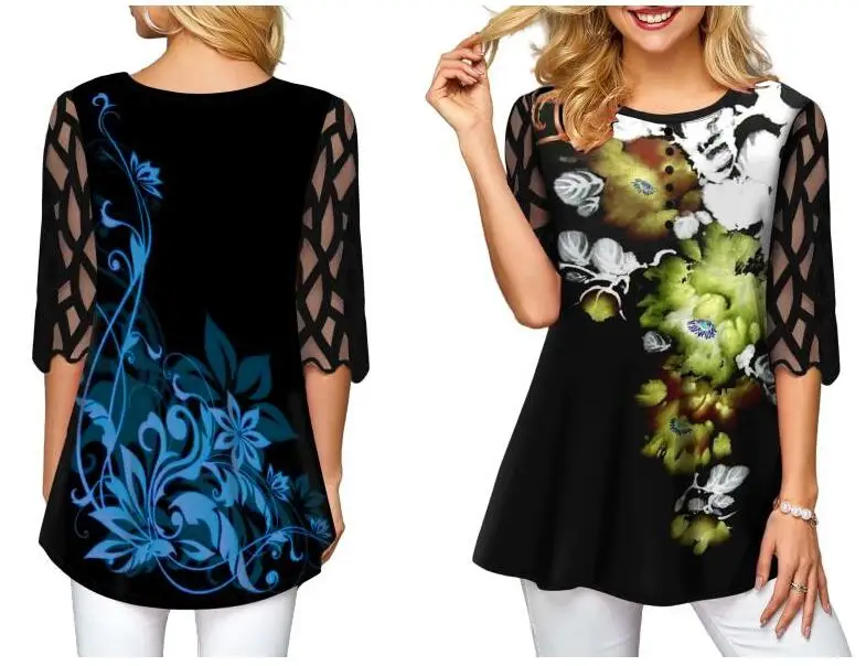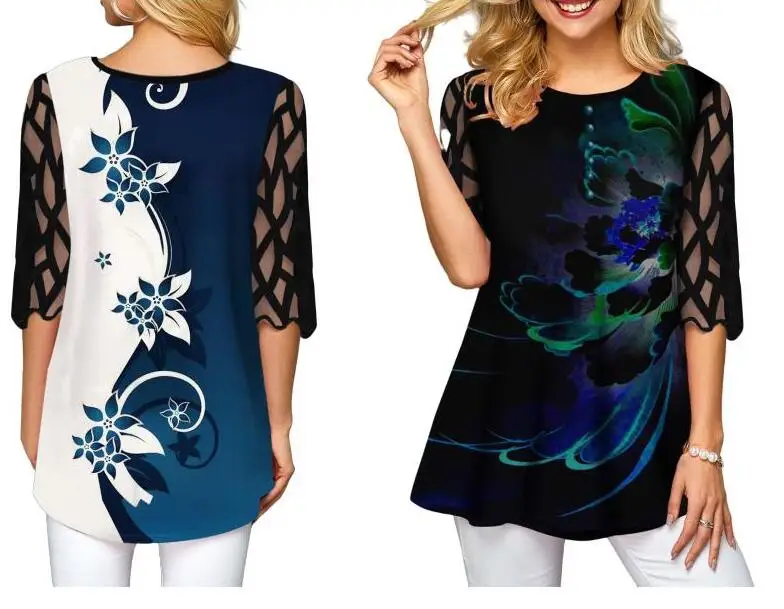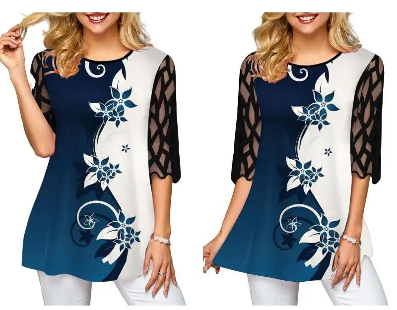 Plus Size 4xl 5XL Shirt Blouse Female 2020 Spring Summer New Tops O-neck Half Sleeve Lace Splice Print Boho Women shirt