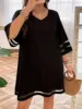 Plus Size Black Dress Women Retro Casual Mid Length V-Neck Loose Casual Long Sleeves Dresses Female Pullover Skirt Vestidos