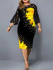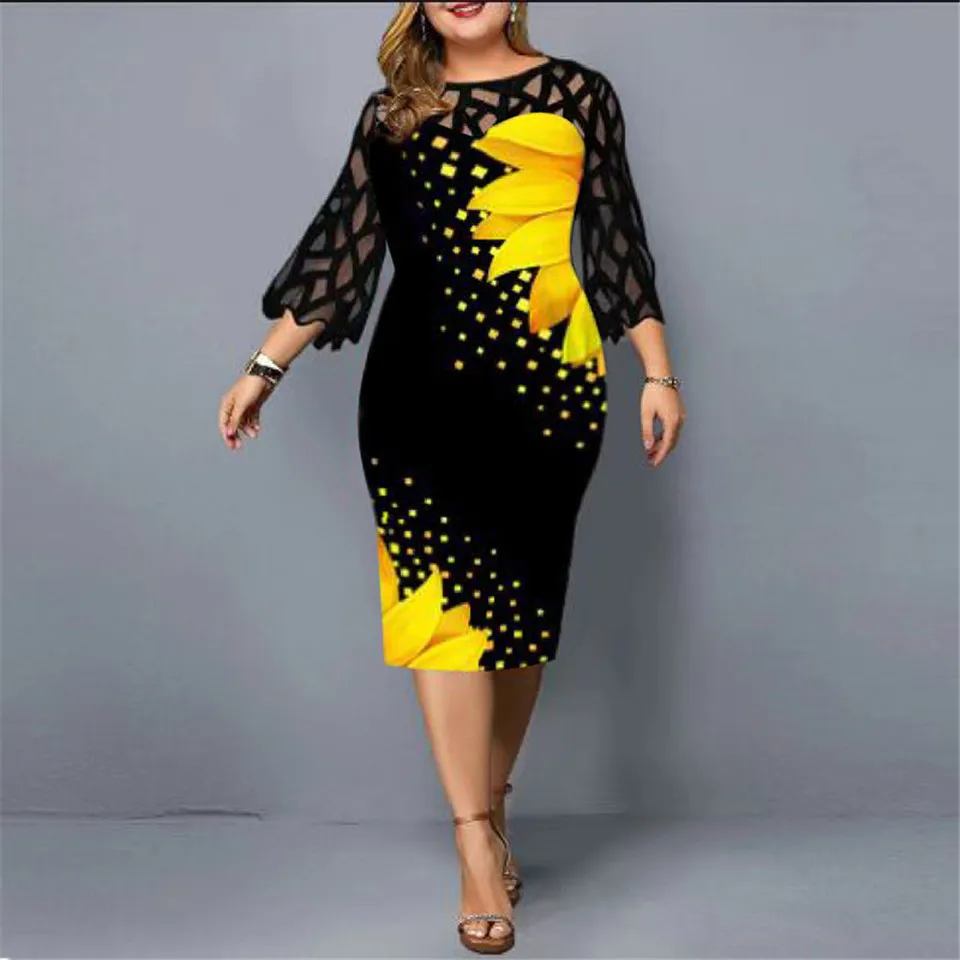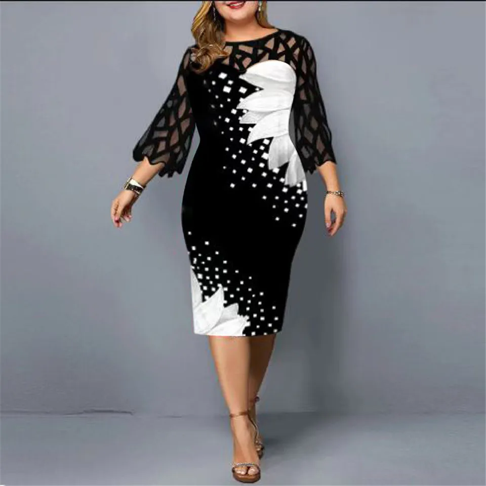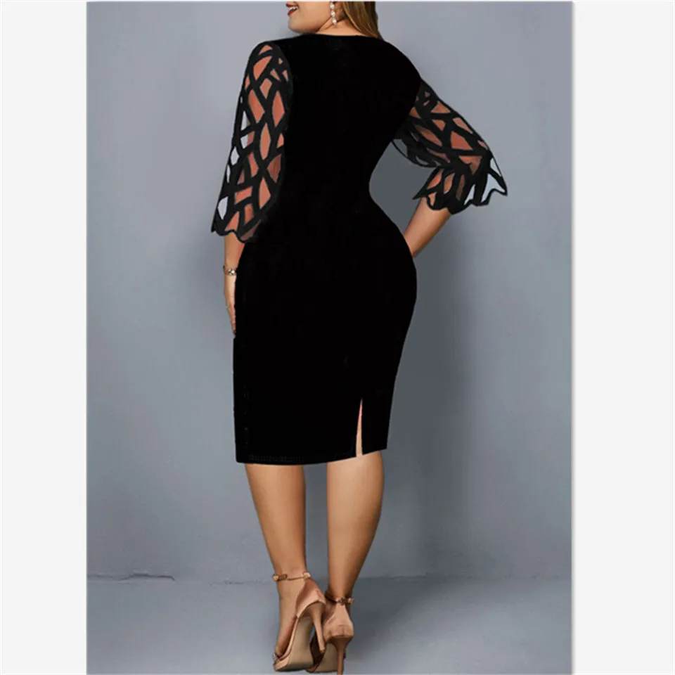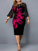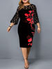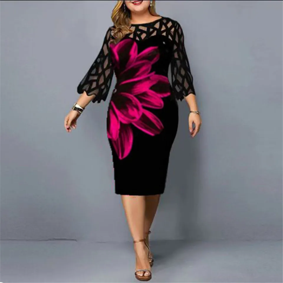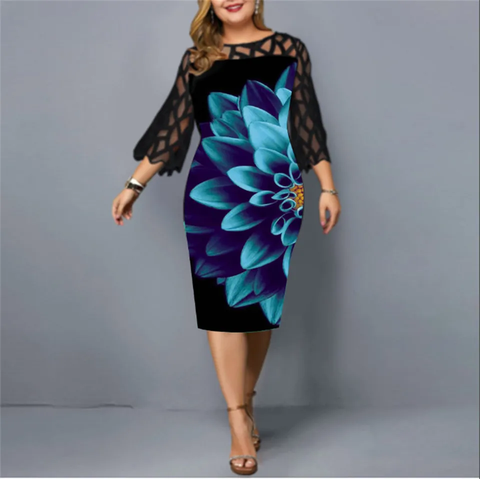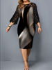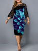 Plus Size Elegant Print Pencil Dress for Office Lady Patchwork Design Lace Decor O-Neck Flare Sleeve Mid Waist Slim Hips Dress