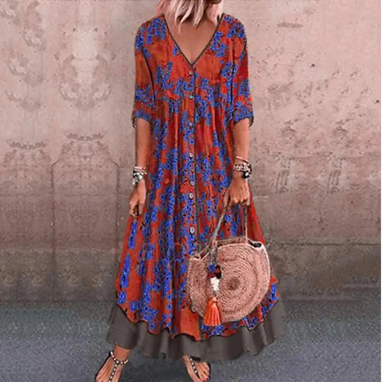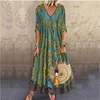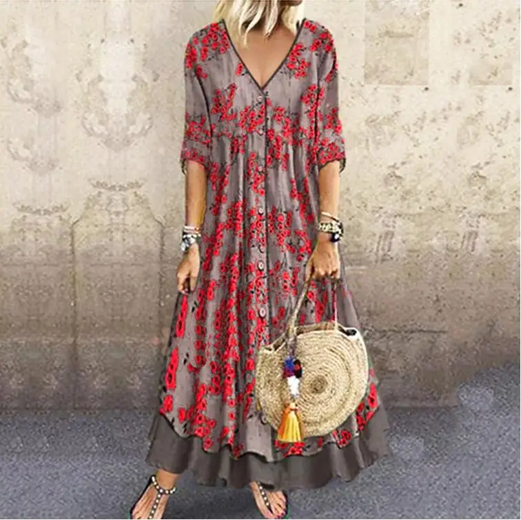 Plus Size Summer 2020 Long Dress Women V-Neck Floral Printed 3/4 Sleeve Maxi Swing Dress Casual Loose Dress