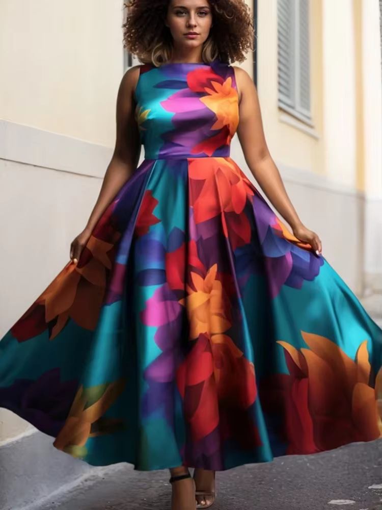 Plus Size Women Floral Printing Dress Sleeveless Round Neck Satin A-line Female Elegant Fashion Summer Dresses 2025