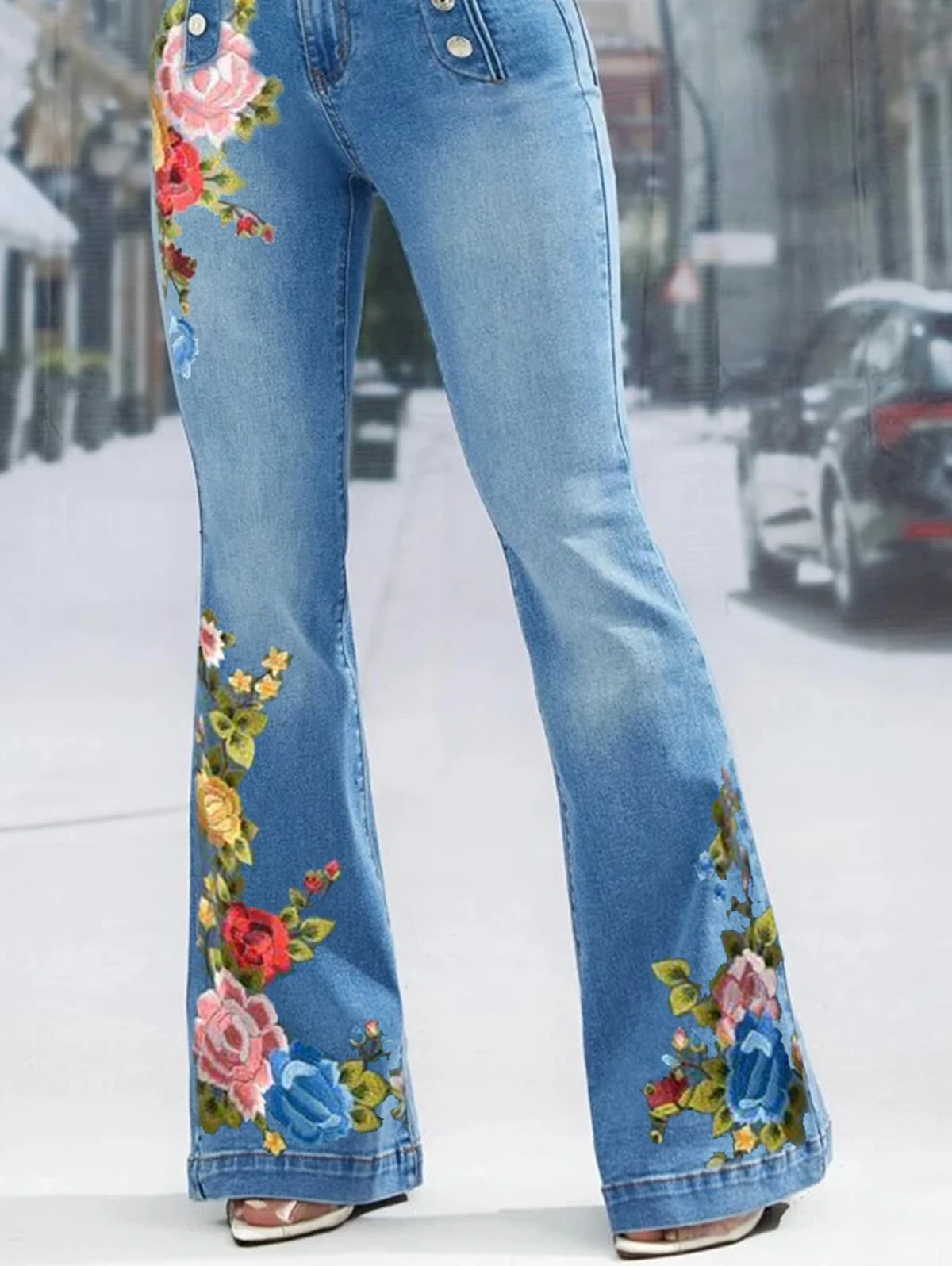 Plus Size Women Jeans Plain Button Decor Flare Leg Long Denim Pants Floral Embroidery Female High Waist Button Wide Leg Jeans