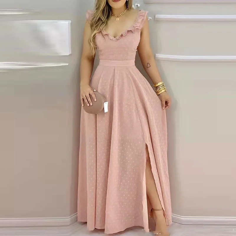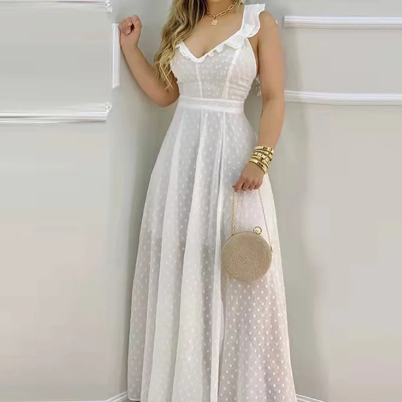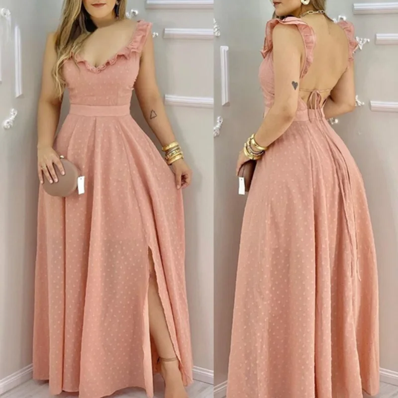 Polka Dot Print Ruffle Hem Open Back Slit Maxi Long Dress Women