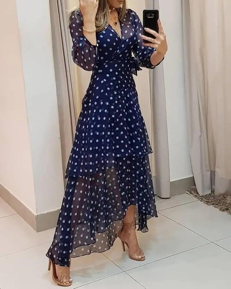 Polkadot Print Layered Ruffles Maxi Dress