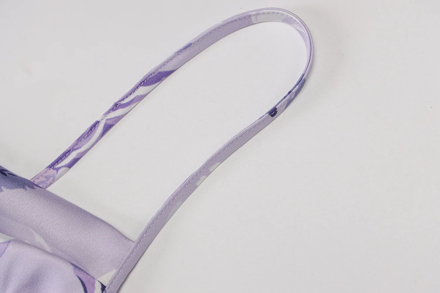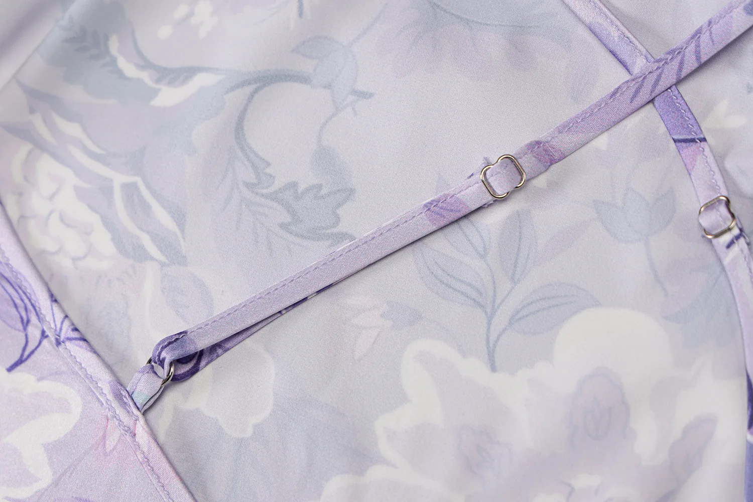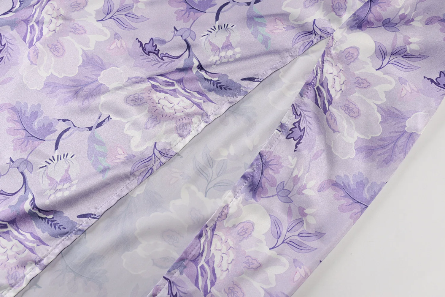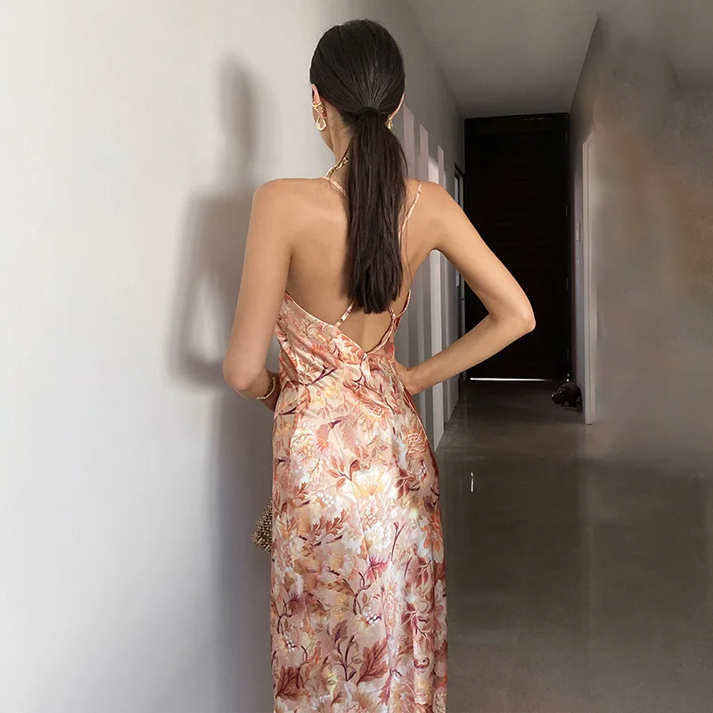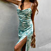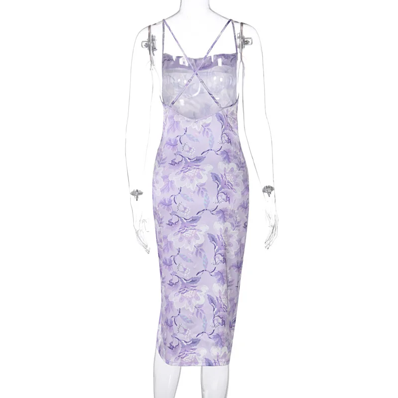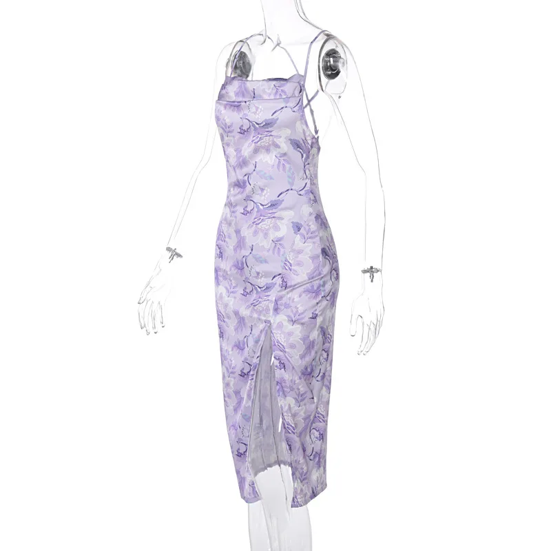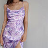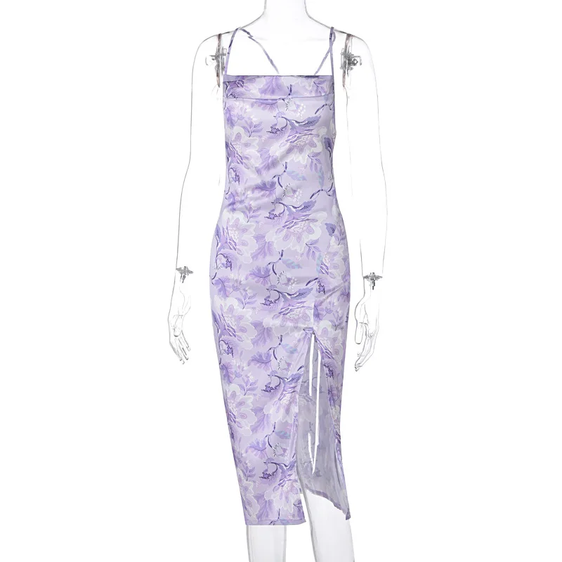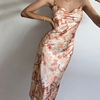 Print Floral Satin Dress Ruched Midi Split Summer 2021 Strap Backless Bandage Women Sexy Party Dresses