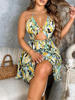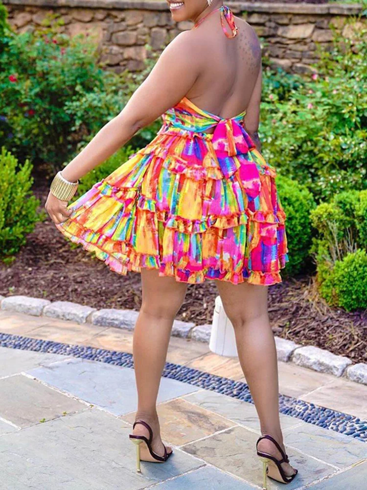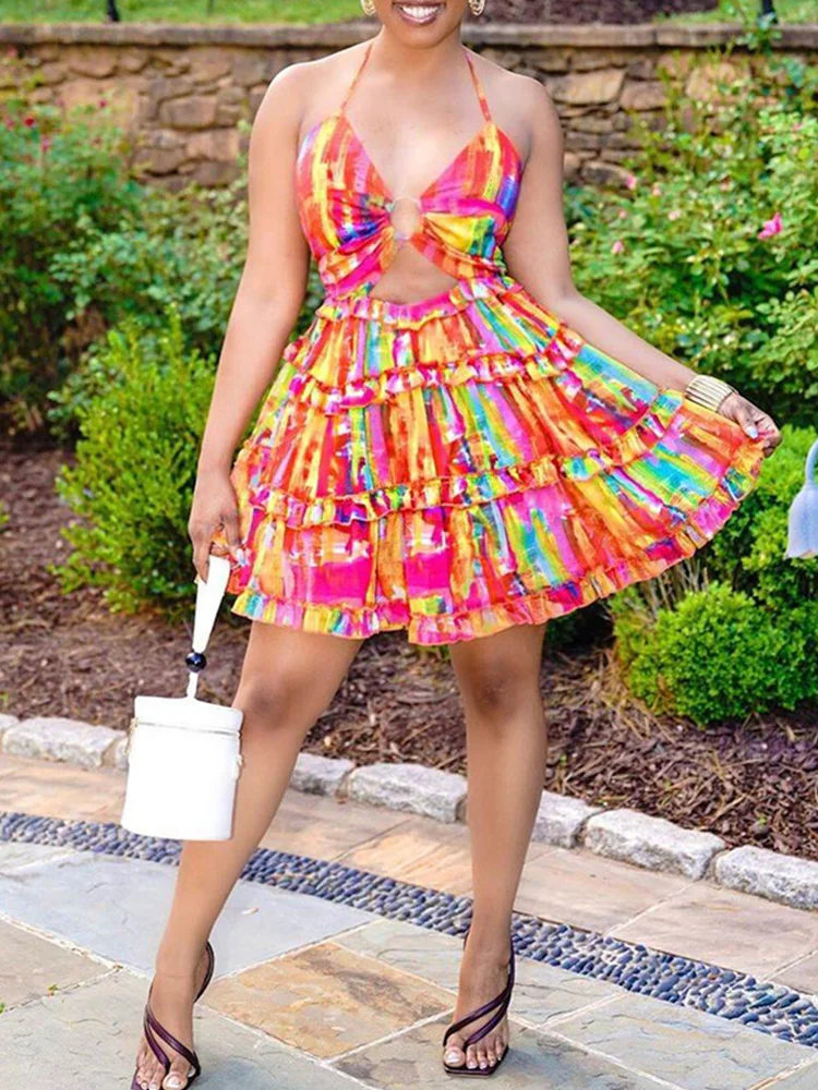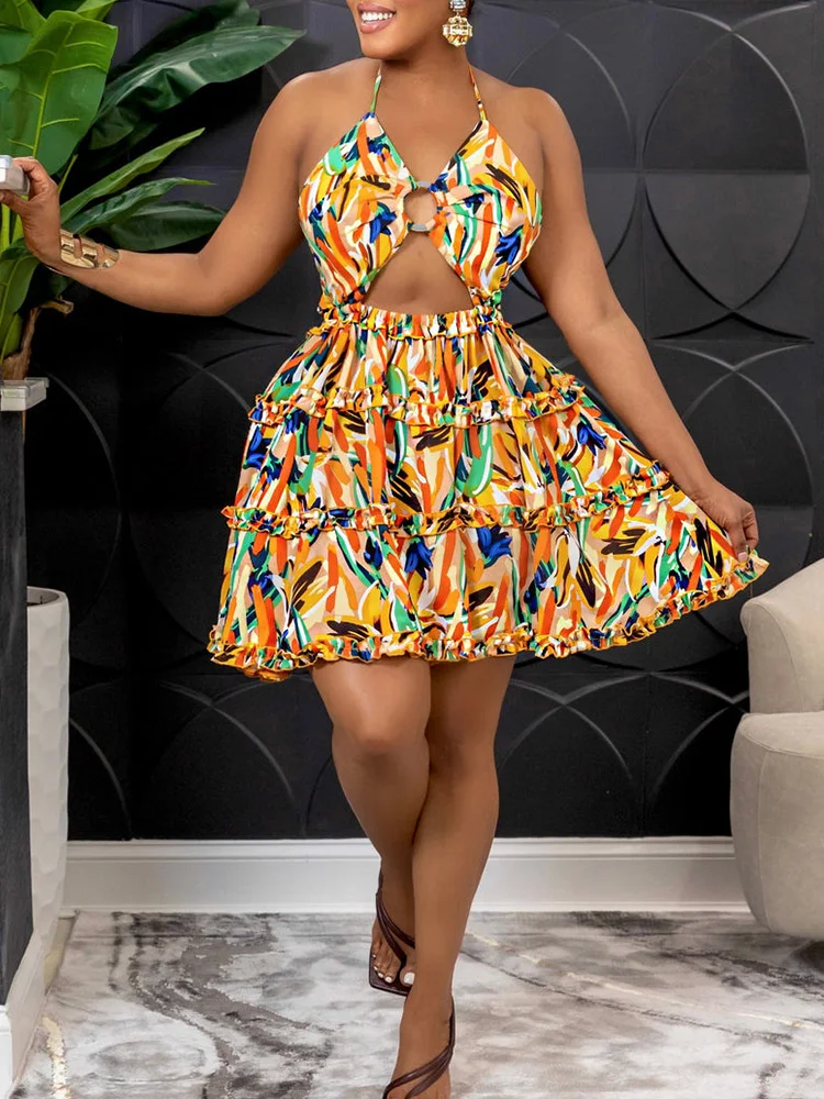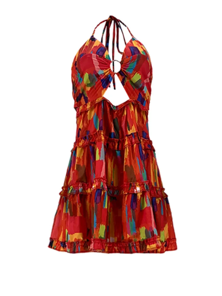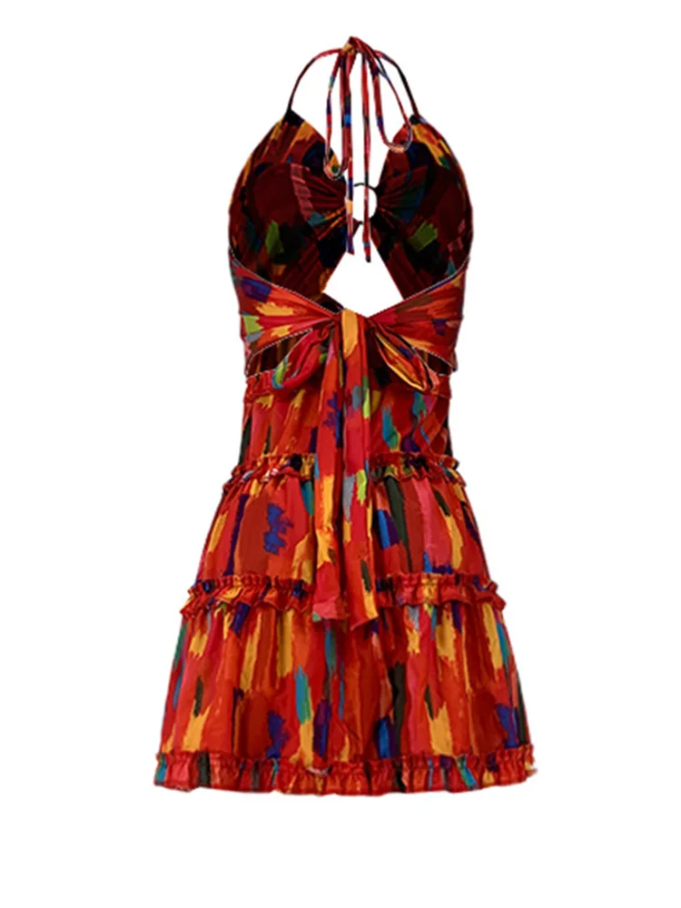 Printed Backless Halter Summer Dress Women Sexy Deep V Neck O-ring Design Mini Dress