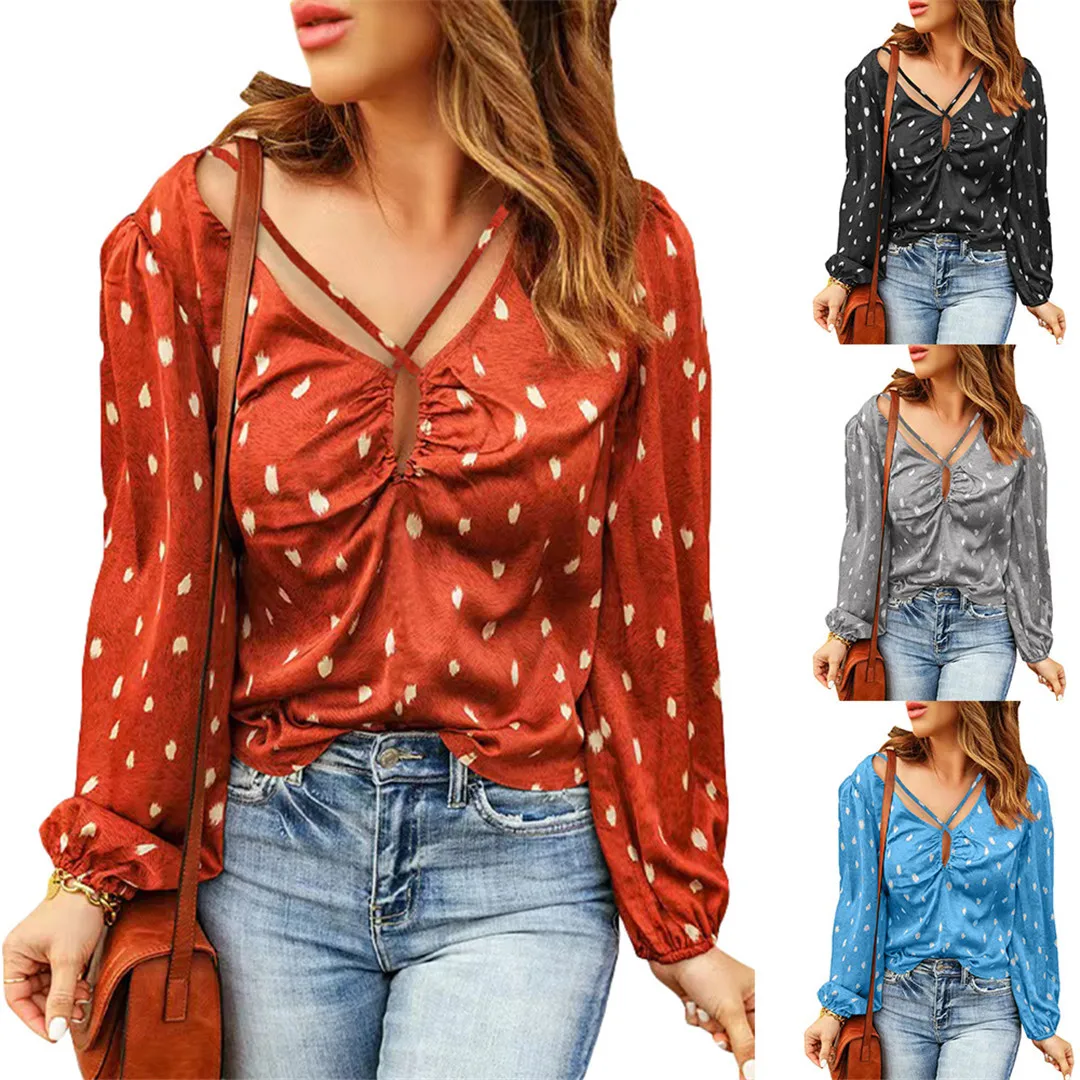 Printed Polka Dot Shirt Women's Summer New V-neck Cross Drawstring Printed Puff Sleeve Top Women Blusas Mujer De Verano 2022
