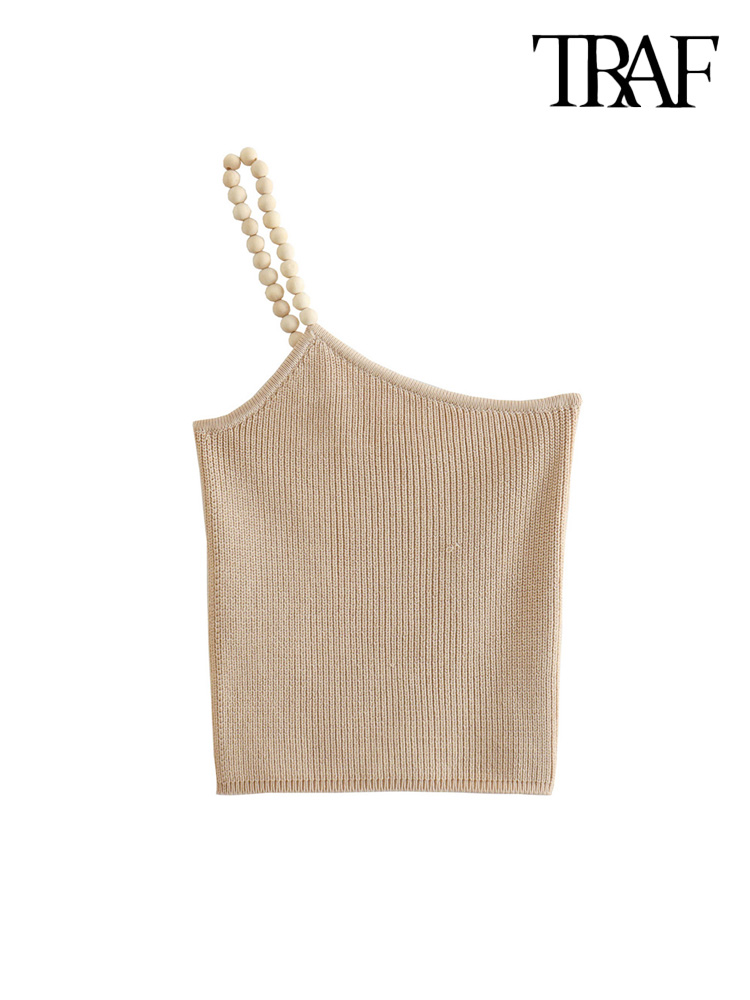 TRAF Women Fashion Asymmetrical Crop Knit Tank Tops Vintage Backless Beaded Straps Female Camis Mujer
