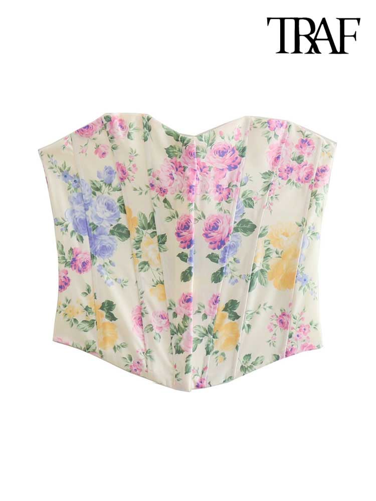TRAF Women Fashion Front Hooks Floral Print Bustier Vintage Sweetheart Neck Exposed Shoulders Female Camis Mujer