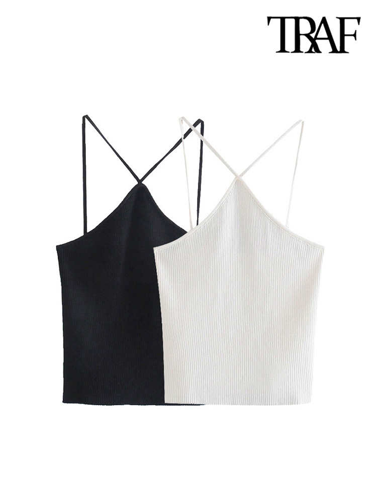 TRAF Women Sexy Fashion Ribbed Knit White Cropped Tank Tops Vintage Backless Thin Straps Female Camis Mujer