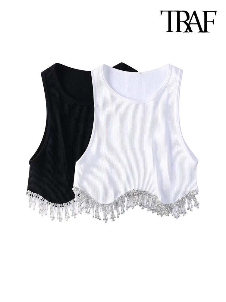 TRAF Women Fashion With Rhinestone Tassel Crop Ribbed Knit Tank Tops Vintage O Neck Sleeveless Female Camis Mujer