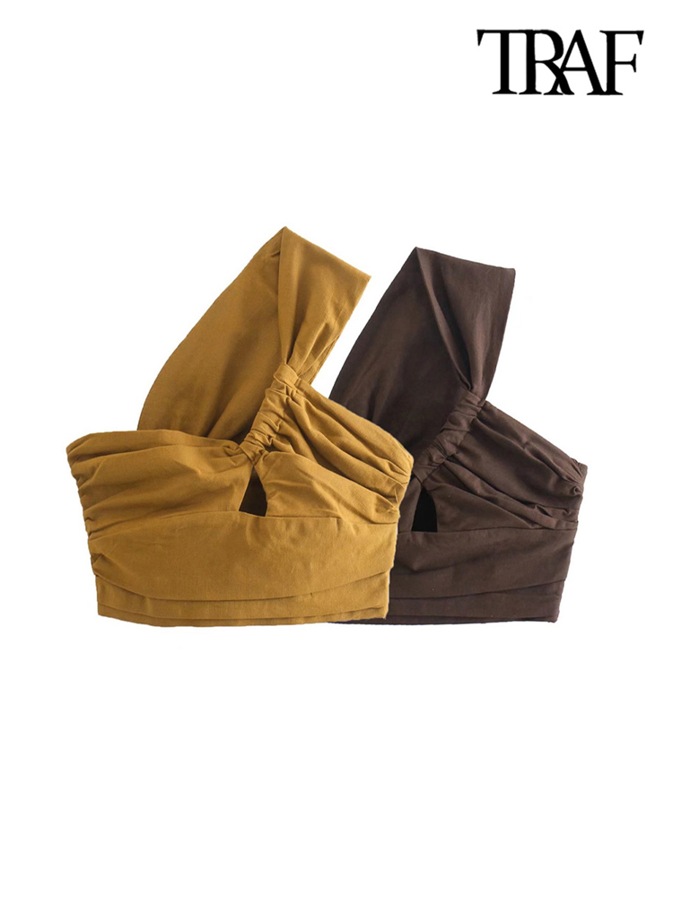 TRAF Women Sexy Fashion Pleated Asymmetry Linen Crop Tank Tops Vintage One Shoulder Side Zipper Female Camis Mujer