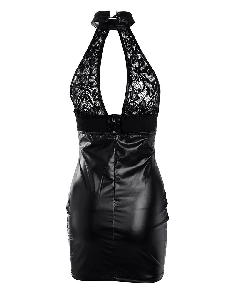 PU Leather Contrast Lace Halter Bodycon Dress Women Sexy Cutout Button Design Night Out Party Dress