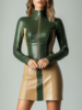 PU Leather Dresses for Women High Neck Zipper Colorblock Bodycon Mini Dress Women Long Sleeve Elegant A-Line Dress Streetwear