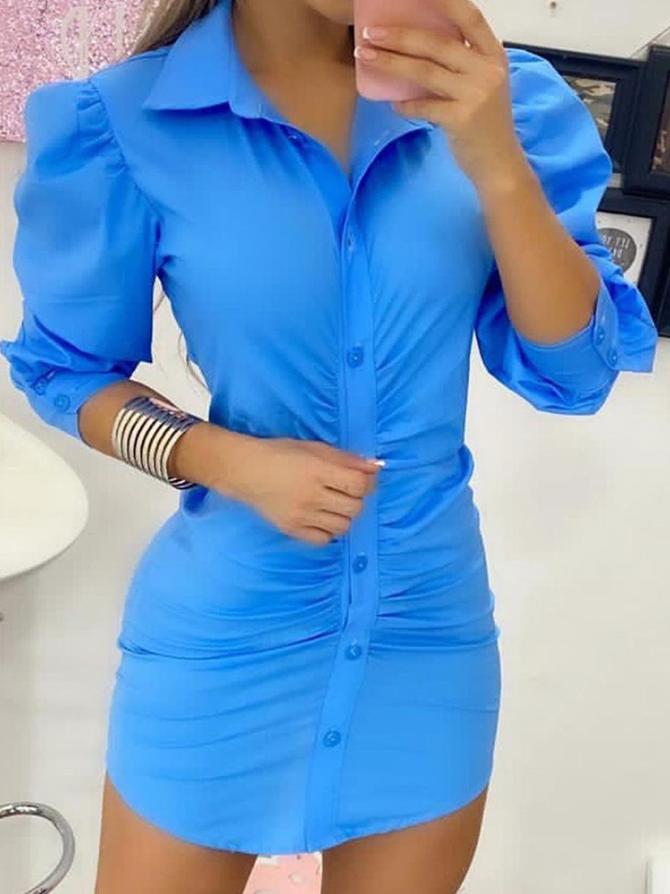 Puff Sleeve Ruched Shirt Dress Women Long Sleeve Slim Casual Mini Work Dress