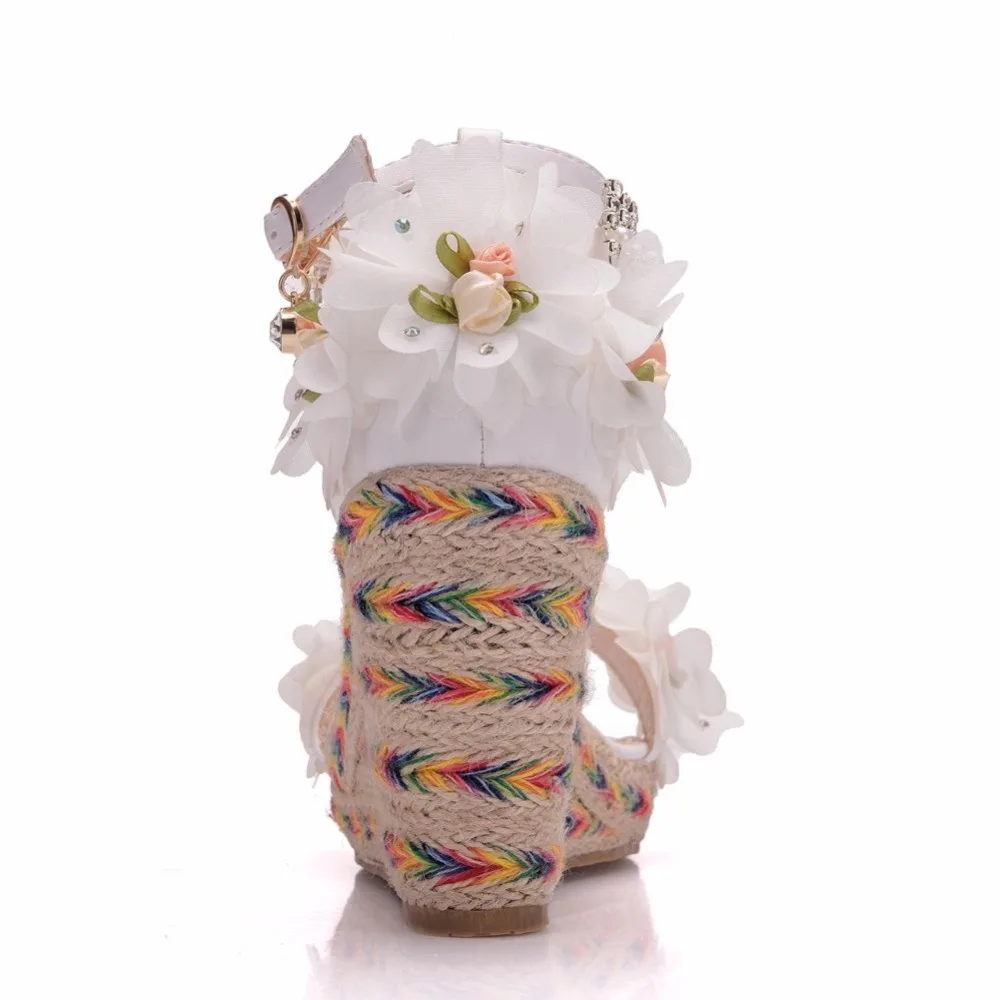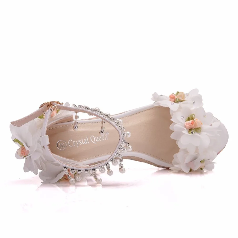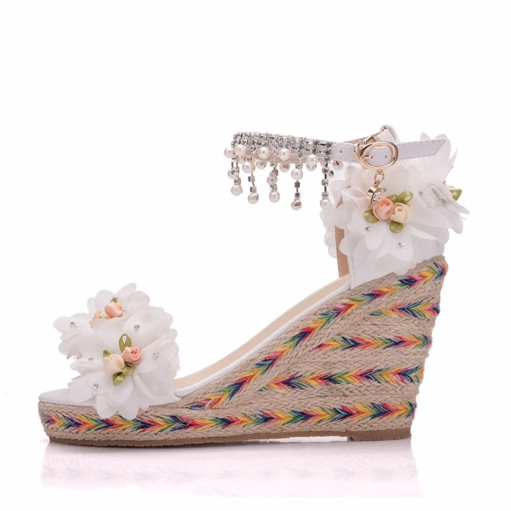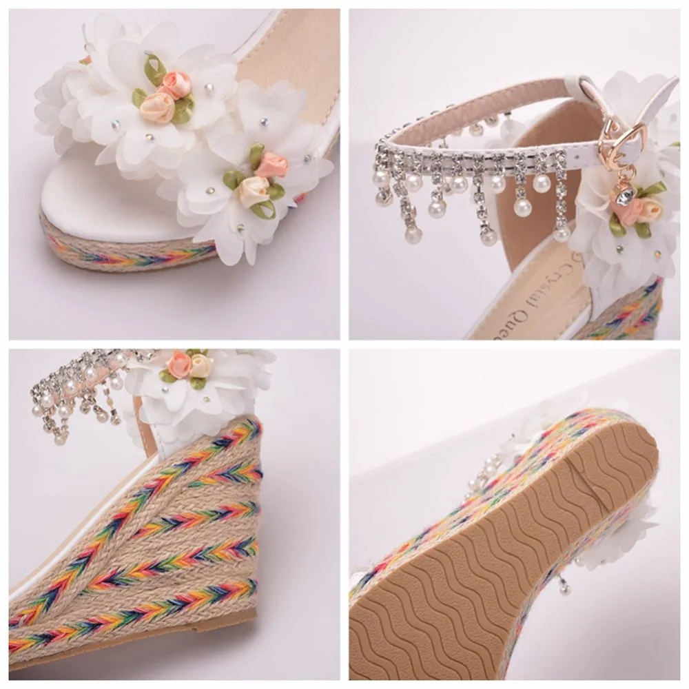 Queen 9cm Peep Toe Platform Wedges High Heel Sandals White Flower Wedges Sandals Platform Sandals Shoes 33-42