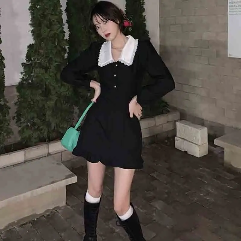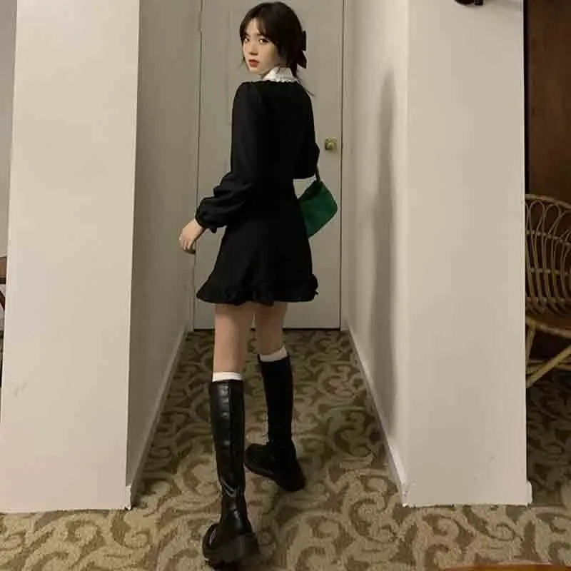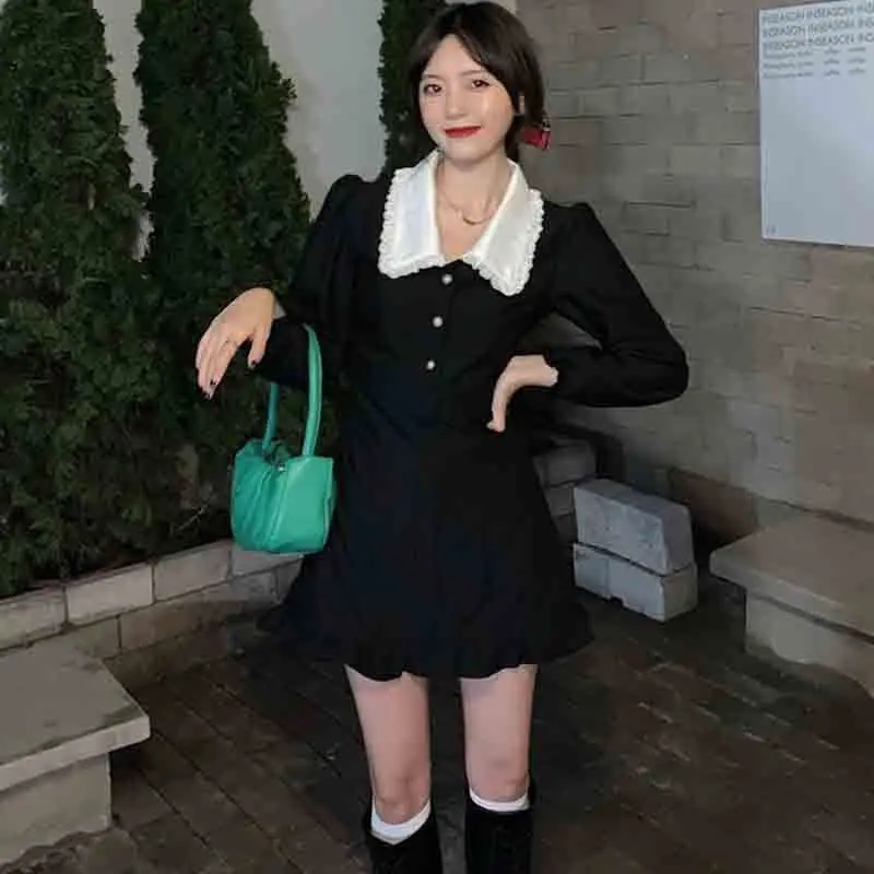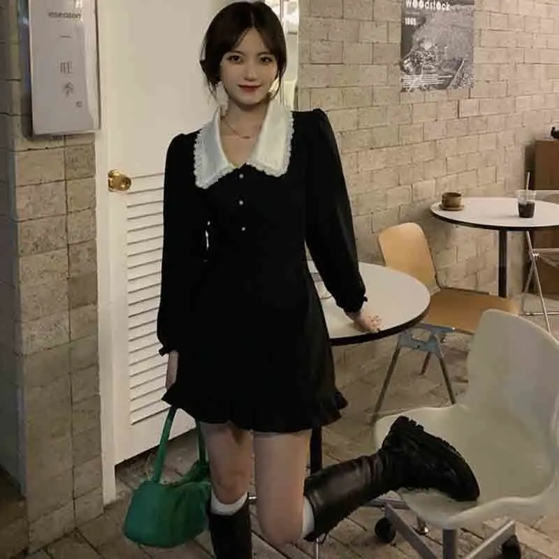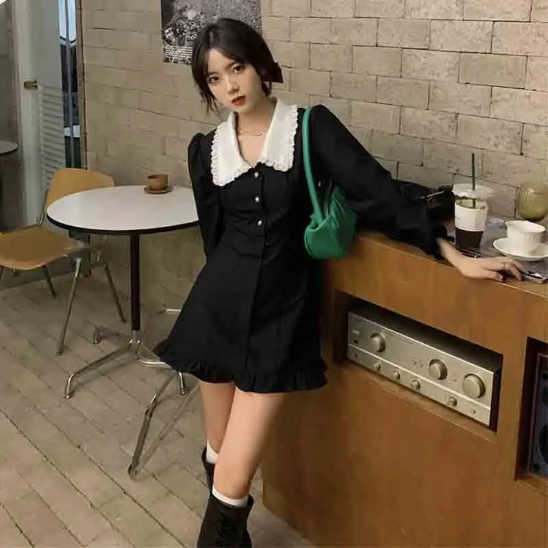 QWEEK Vintage Black Mini Dress Women French Lace Peter Pan Collar Ruffle Short Dresses Bodycon Wrap Robes 2021 Fashion Autumn