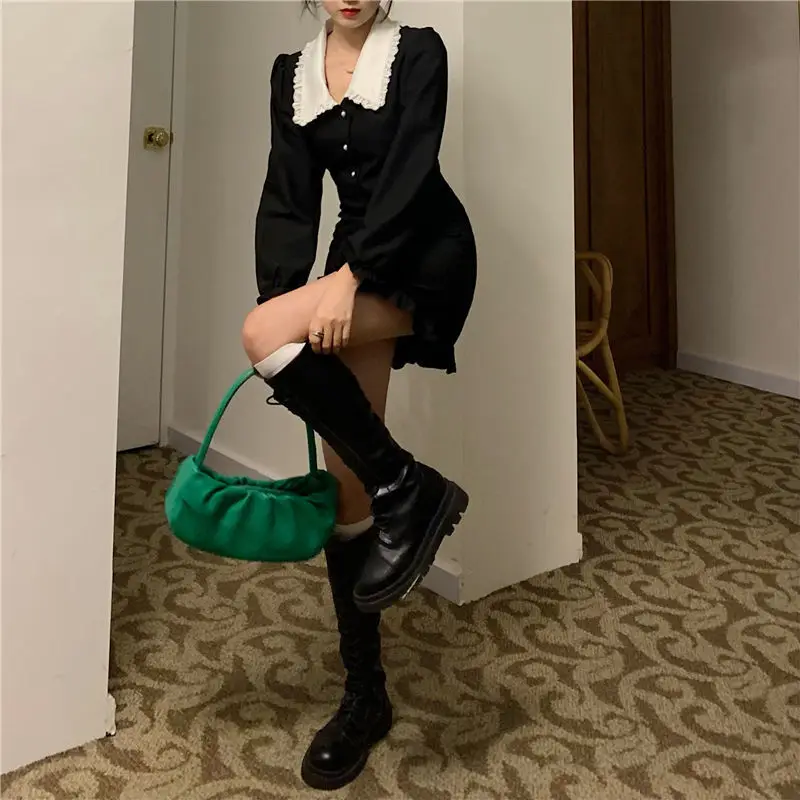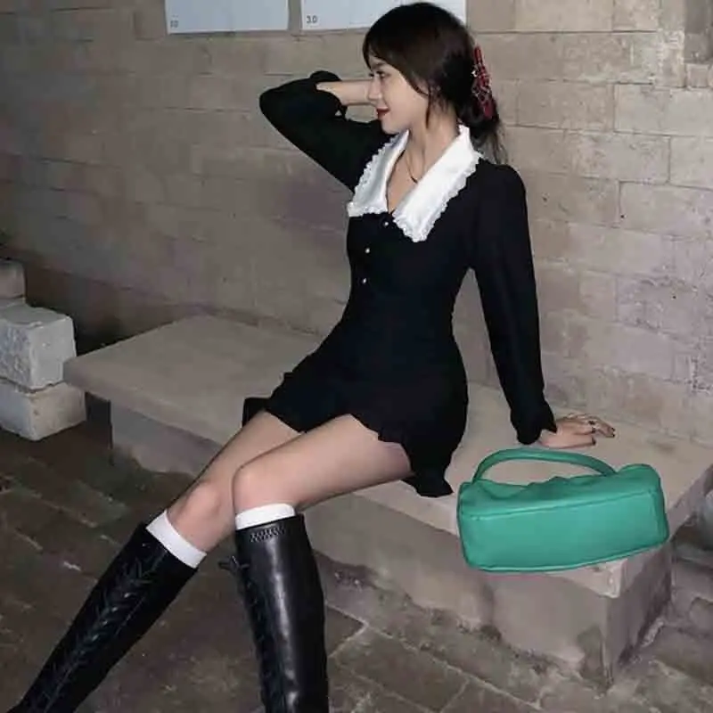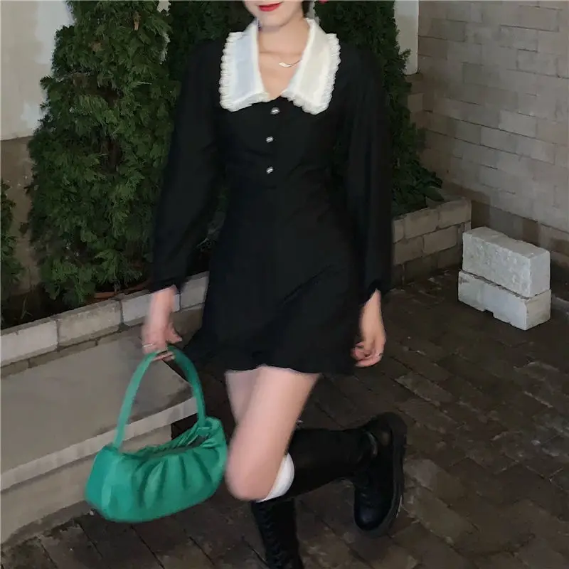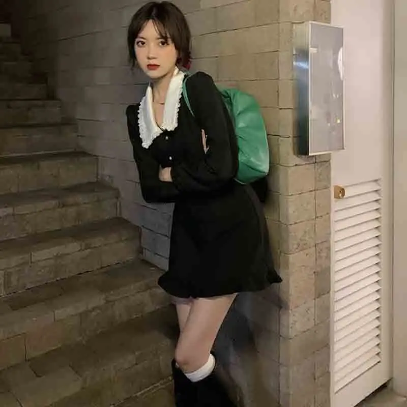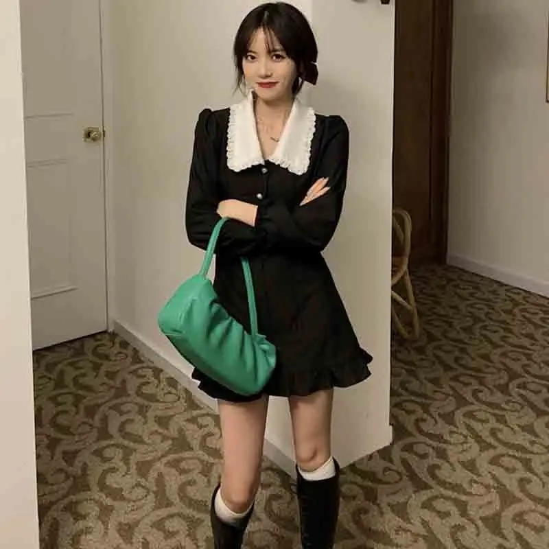 QWEEK Vintage Black Mini Dress Women French Lace Peter Pan Collar Ruffle Short Dresses Bodycon Wrap Robes 2021 Fashion Autumn